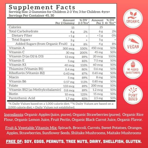 Vitaminas Abrangentes: 13 vitaminas e fitonutrientes naturais de 9 quilos de frutas e vegetais, para uma absorção até 4 vezes melhor. Sem adição de vitaminas sintéticas. Vitamina A como beta-caroteno mais vitamina C, D, E, K1, B1, B2, niacina, B6, folato, B12, biotina e ácido pantotênico.