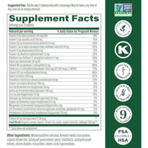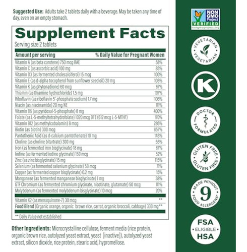Vitaminas pré-natais para mulheres: você pode tomar a qualquer hora do dia, até mesmo. com o estômago vazio. 2 comprimidos por porção Não OGM, vegetariano; Testado para mais de 125 produtos químicos; Elaborado sem 9 alérgenos: leite, ovos, amendoim, frutos secos, soja, trigo, peixe, marisco e gergelim; Não contém gluten