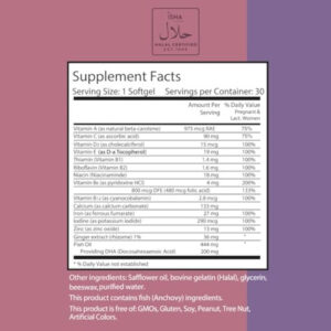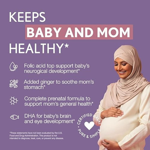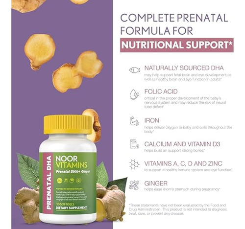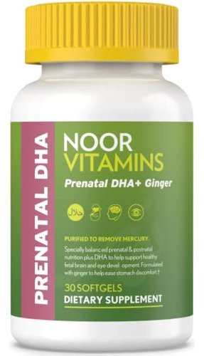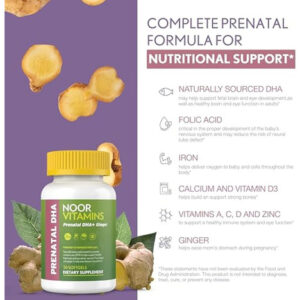 Noor Vitamins As vitaminas pré-natais com DHA incluem vitaminas essenciais, ácido fólico, DHA e gengibre que acalmam o estômago da mãe. Vitamina pré-natal halal não transgênica usada antes/durante/após a gravidez (fornecimento de 1 mês)