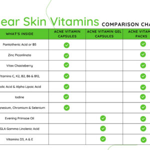 The Clear Skin Acne Vitamins or acne supplement is a combination of vitamins, minerals, and herbs known for their acne-prone skin benefits and is half best selling Clear Skin Vitamin Packs. Besides helping you clear up your skin naturally, it will help your skin glow. Glowing skin is healthy skin. Why is the Clear Skin Vitamin Pack the best acne supplement? -Contains the highest quality acne vitamins and minerals. -Works on all kinds of acne, genetic acne, hormonal acne, adult acne, cystic acne, pimples on back or back acne, chest pimples, teenage acne. -Customers have told us they are also a good treatment for hidradenitis suppurativa Zinc for acne: Most other acne supplements use a cheaper form of zinc; the Clear Skin Vitamin Pack contains zinc picolinate, which is a higher quality, more bioavailable form of zinc and is the best form of zinc for acne among peer-reviewed research papers. Pantothenic acid for acne: Pantothenic acid can help metabolize skin oils, counteract hormonal imbalances, increases your blood circulation and reduce your stress levels! Vitex Chasteberry or Vitex Agnus-Castus or Chaste tree or vitex berry which goes by a lot of names but helps with hormone balance. We have not included biotin in the Clear Skin Vitamin Pack as biotin can often lead to acne breakouts in many people, which is precisely what we are trying to stop! If you are looking for acne pills or an acne supplement, before trying acne medication, give the Clear Skin Vitamin Capsule a try, and we will stand behind its results with a 75-day money-back guarantee.</ – Pantothenic Acid B5, Zinc Picolinate, Vitex Chastebery & 12 other powerful ingredients in one powerful capsule. An all natural Acne Treatment and better than using acne patches. – Clear Skin Capsules provide your body with the nutrients it needs to clear up and keep acne away. The dietary value of the product makes it a very effective nutritional supplement to treat all types of acne. – Best in the market – You can compare our ingredients and quality with other similar products in the market, and you will understand why this is the best clear skin supplement on the market. – Great preventative acne pills for Men or women. Great for all different types of acne and clear skin issues. Just read the reviews. – All Natural Botanicals and Minerals. Made in the USA It has been manufactured and packaged in NSF Certified facilities and is in compliance with Good Manufacturing Practices (GMP) established by the U.S. Food and Drug Administration (FDA).