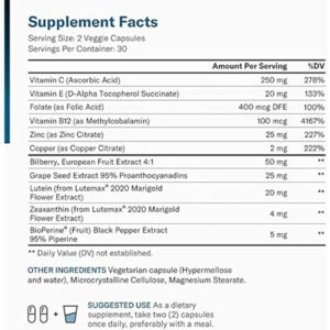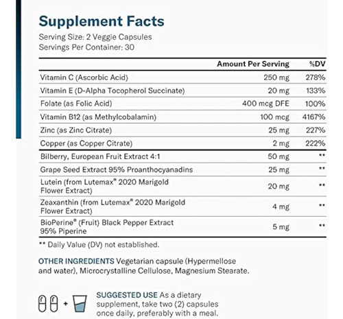 AREDS 2 Eye Support & Vision Vitamins: Nosso suplemento para a saúde ocular foi habilmente elaborado para garantir suporte ideal para a saúde ocular. Contém Lutemax luteína, zeaxantina, extrato de mirtilo clinicamente comprovado e vitamina C, E, B12, ácido fólico, zinco e cobre