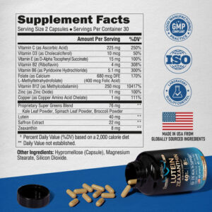 – Luteína e zeaxantina Experimente um suporte visual superior com nosso suplemento de luteína e zeaxantina. Proteja e nutra seus olhos com nossas vitaminas oculares premium de luteína 40 mg e zeaxantina 8 mg. Formulada com dosagens clinicamente estudadas, essa dupla poderosa promove a saúde ocular e ajuda a manter uma visão clara e nítida à medida que você envelhece.