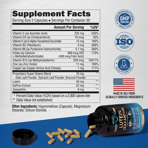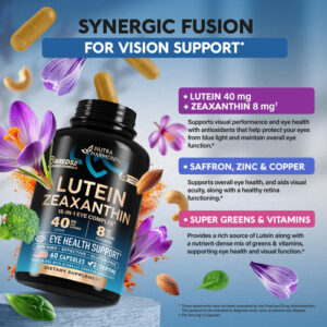Complexo avançado com luteína, zeaxantina, açafrão, cobre, vitamina E e zinco testados pela AREDS2, aprimorado por vitaminas essenciais para a saúde ocular: B2, B6, B9, B12, C e D3 com supervegetais: couve, brócolis e espinafre – Suporte visual superior – Suporte visual abrangente para pessoas de todas as idades! Os suplementos de luteína e zeaxantina mantêm a saúde geral dos olhos e mantêm seus olhos funcionando da melhor maneira possível. Os suplementos oftalmológicos oferecem potentes benefícios antioxidantes, auxiliando na saúde ocular e na clareza e conforto visuais a longo prazo.