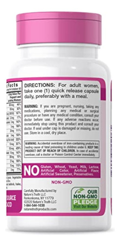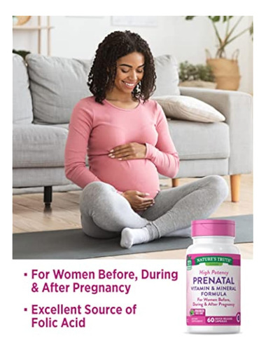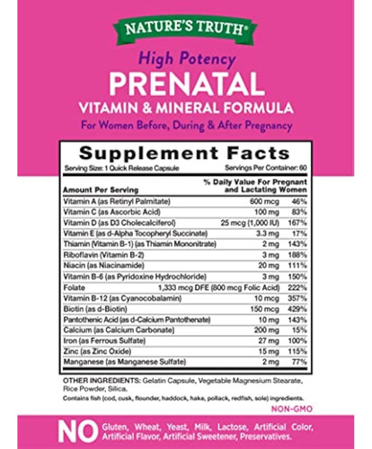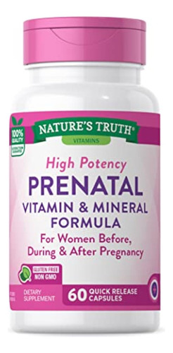 Nature’s Truth Vitaminas pré-natais com ácido fólico | 60 cápsulas | Suplemento não OGM e sem glúten