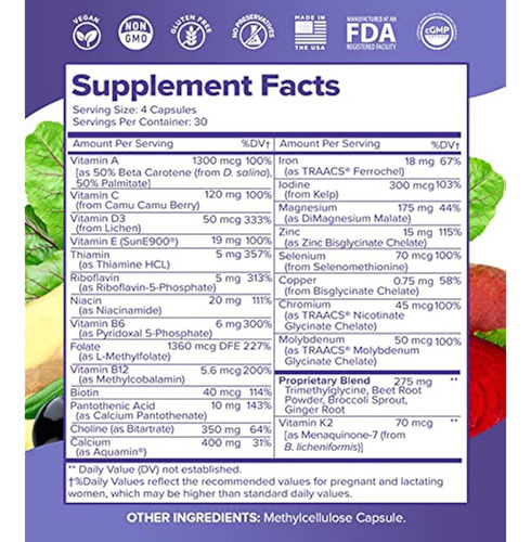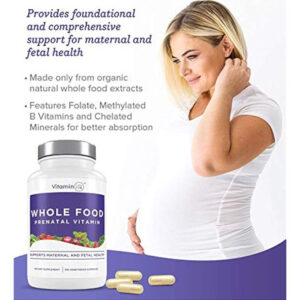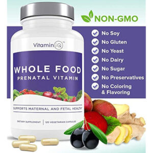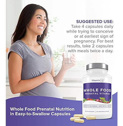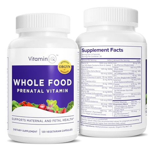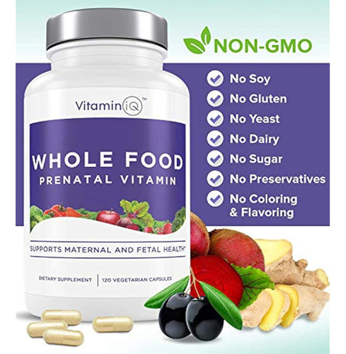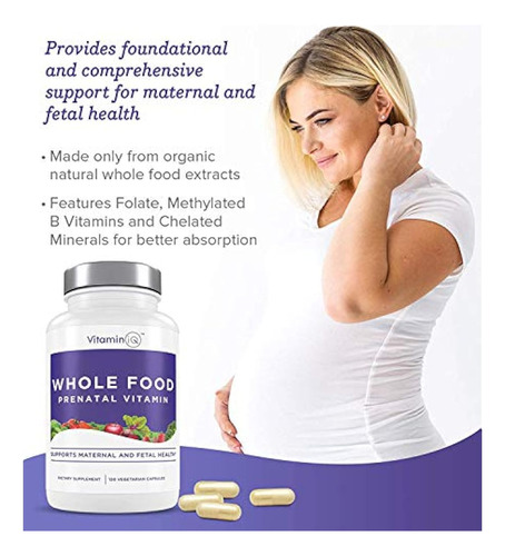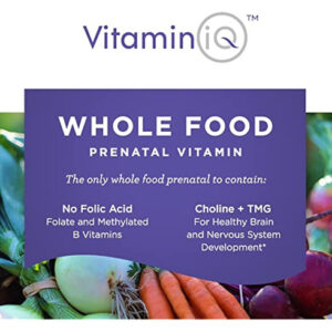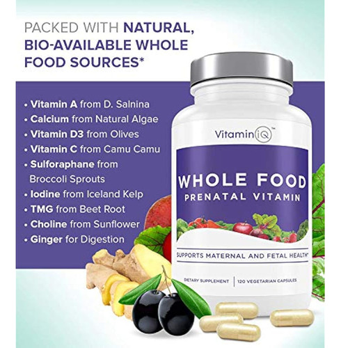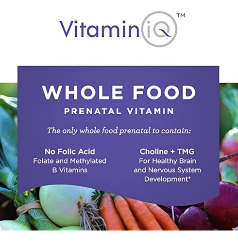 Vitamina pré-natal de alimentos integrais para mães e bebês saudáveis: Para uma nutrição adequada, desde o início, VitaminIQ Whole Food Prenatal é um multivitamínico pré-natal diário que fornece as necessidades nutricionais exclusivas, essenciais para a saúde da mãe e do bebê. Além disso, não usamos ácido fólico sintético em nossas vitaminas pré-natais, mas em vez disso usamos folato e B metilado naturalmente encontrados em alimentos integrais para melhor absorção, o que é essencial para o desenvolvimento saudável do tubo neural e do cérebro em bebês.< br>350 mg de colina + TMG recomendado para uma gravidez saudável: nosso suplemento pré-natal inclui 100 da dose diária recomendada de colina + TMG combinado com vitamina A, C, D3, E, K2, B6, B12, riboflavina, tiamina, niacina, folato, biotina, cálcio, ferro, zinco, magnésio e muito mais para suporte oportuno ao desenvolvimento mental do cérebro, saúde do sistema nervoso e saúde digestiva.