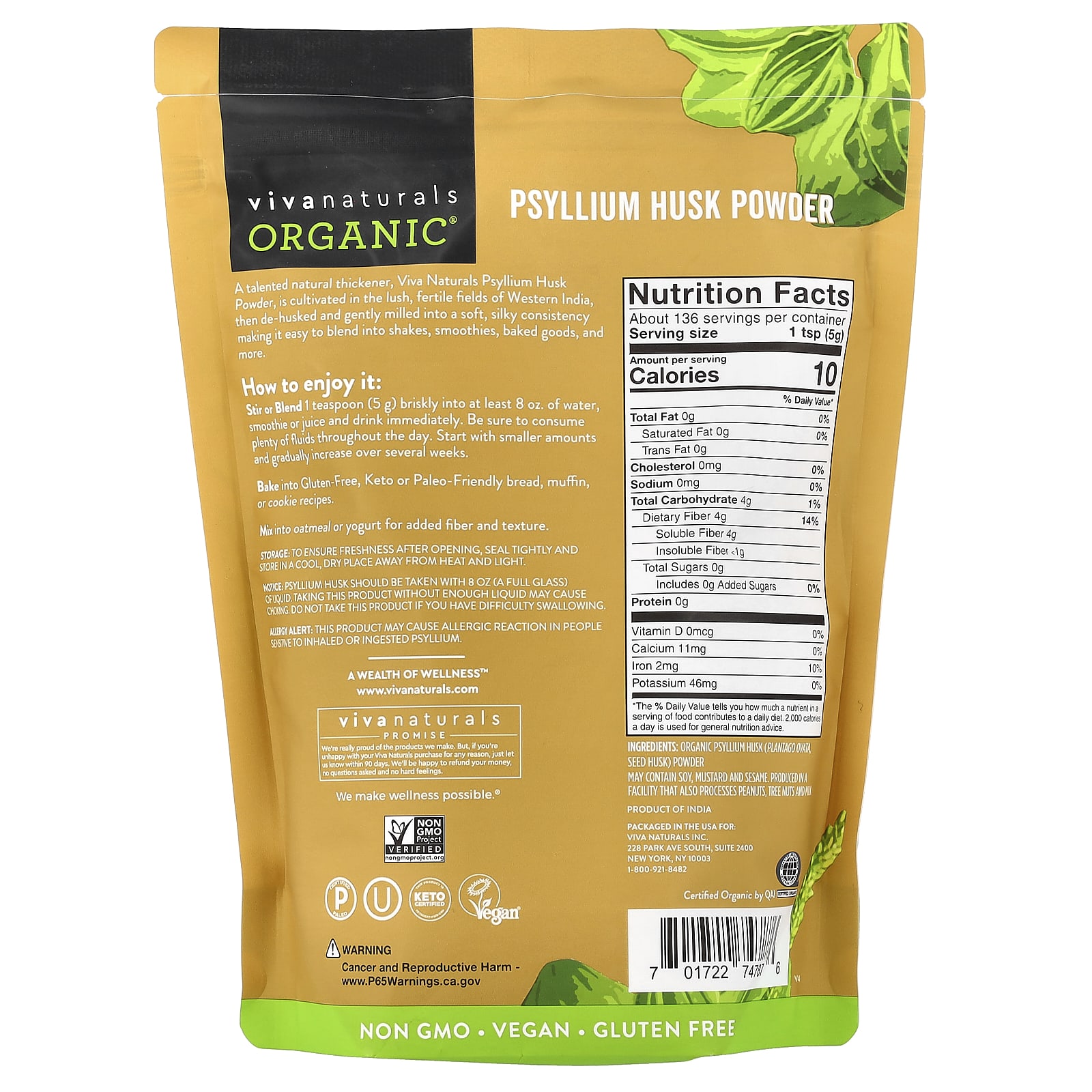 Um espessante natural habilidoso, a Casca de Psílio em Pó da Viva Naturals, é cultivado nos campos exuberantes e férteis da Índia Ocidental. Em seguida, é descascado e moído suavemente até atingir uma consistência macia e sedosa, facilitando a mistura em shakes, smoothies, assados e muito mais.