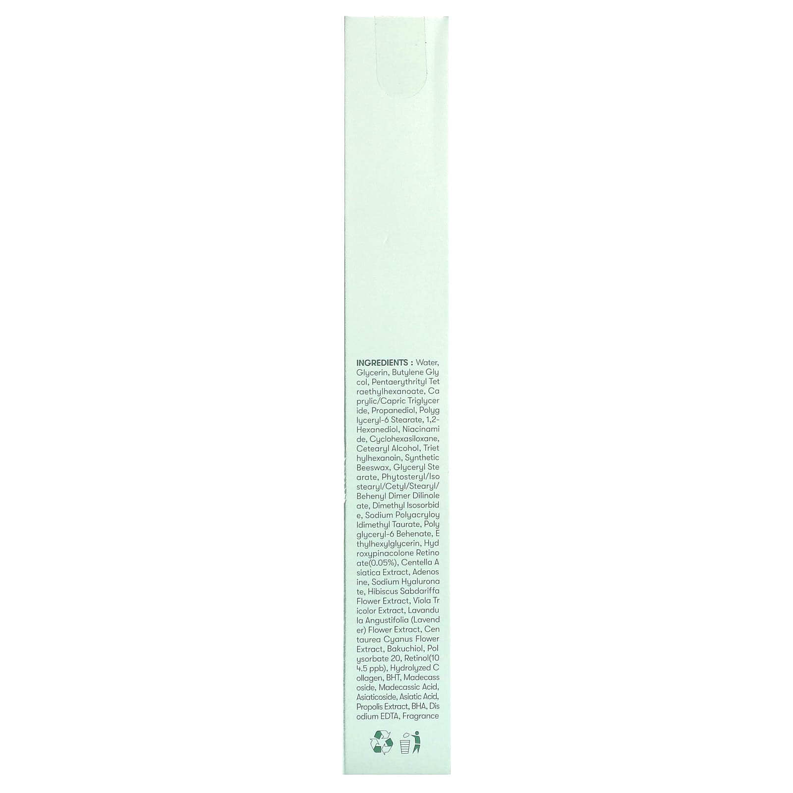 Água, glicerina, butylene glycol, pentaerythrityl tetraethylhexanoate, caprylic/capric triglyceride, propanediol, estearato de poliglicerol-6, 1,2-hexanodiol, nicotinamida, cyclohexasiloxane, álcool cetoestearílico, triethylhexanoin, cera de abelha sintética, monoestearato de glicerila, phytosteryl/isostearyl/cetyl/stearyl/behenyl dimer dilinoleate, dimetil isossorbida, taurato de poliacrilildildimetil sódico, beenato de poliglicerila-6, ethylhexylglycerin, retinoato de hidroxipinacolona (0,05%), extrato de Centella asiatica, adenosina, hialuronato de sódio, extrato da flor de Hibiscus sabdariffa, extrato de Viola tricolor, extrato da flor de Lavandula angustifolia (lavanda), extrato da flor de Centaurea cyanus, bakuchiol, polissorbato 20, retinol (10 4,5 ppb). colágeno hidrolisado, bht, madecassoside, madecassic acid, asiaticosídeo, asiatic acid, extrato de própolis, bha, edetato dissódico, fragrância.