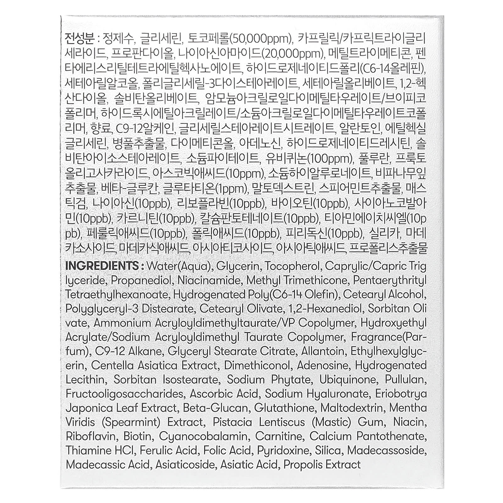 Água (aqua), glicerina, tocoferol, caprylic/capric triglyceride, propanediol, nicotinamida, methyl trimethicone, pentaerythrityl tetraethylhexanoate, poli-hidrogenada (olefina c6-14), álcool cetoestearílico, polyglyceryl-3 distearate, cetearyl olivate, 1,2-hexanediol, sorbitan olivate, ammonium acryloyldimethyltaurate/vp copolymer, copolímero de acriloildimetiltaurato de sódio e acrilato de hidroxietila, fragrância (perfume), c9-12 alkane, citrato de monoestearato de glicerila, alantoína, ethylhexylglycerin, extrato de Centella asiatica, dimeticonol, adenosina, lecitina hidrogenada, isoestearato de sorbitana, fitato de sódio, ubiquinona, pullulan, fruto-oligossacarídeos, ácido ascórbico, hialuronato de sódio, extrato da folha de Eriobotrya japonica, betaglucano, glutationa, maltodextrina, extrato de Mentha viridis (hortelã), goma de Pistacia lentiscus (mástique), ácido nicotínico, riboflavina, biotina, cianocobalamina, carnitina, pantotenato de cálcio, cloridrato de tiamina, ferulic acid, ácido fólico, piridoxina, sílica, madecassoside, madecassic acid, asiaticosídeo, asiatic acid, extrato de própolis.
