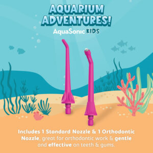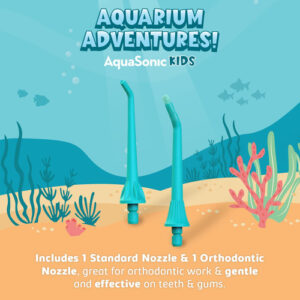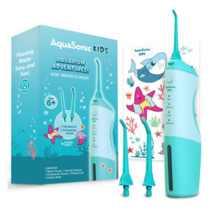 AquaSonic Kids Water Flosser for Ages 6+ Standard Nozzle, Orthodontic Nozzle & Waterproof Stickers 4 Flossing Modes Aquarium Adventures Theme (Blue) – Loved by Kids – Aquarium Adventures Kids Water Flosser is the perfect addition to your childs dental care routine! Designed for children ages 6 and up, this oral irrigator features a rubber grip, a simple 1-button operation, and comes with a waterproof sticker sheet. Kids can customize and decorate their flosser using four adorable characters: Rocco the Starfish, Ziggy the Seahorse, Ruby the Dolphin, and Leo the Shark. – Loved by Parents – This Kids Water Flosser effectively removes food particles and plaque from hard-to-reach areas, promoting healthy teeth and gums. Growing with your child, there are three age-appropriate water pressure levels, plus massage mode. With 2 interchangeable nozzles, this oral irrigator can be used around teeth and gums, braces and brackets. Not only that, its compact and lightweight design makes it perfect for use at-home or on-the-go. – This fun and colorful set includes extra nozzles and waterproof stickers, for a completely cusomizable flosser. It is sure to make flossing fun and engaging for your child while giving you peace of mind of a complete clean. Give your child the gift of healthy teeth and gums with the AquaSonic Kids Water Flosser. – How To Use – Charge the water flosser prior to use. Attach a nozzle. Fill the water tank with lukewarm water. Hold down on the On/Off & Mode button for 5 seconds. Continue to press On/Off & Mode until you reach your desired mode. Wait for the blinking light to stop. Press On/Off & Mode to start flossing. Hold water flosser in an upright position & keep mouth slightly open. At a 90-degree angle slowly move the stream across the teeth. When done, press On/Off & Mode to turn off. – Whats In The Box – 1 water flosser, 1 standard nozzle, 1 orthodontic nozzle, 1 charge cord & 1 waterproof sticker sheet.