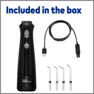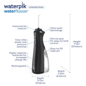 Fio dental portátil recarregável Waterpik Cordless Pearl para dentes, gengivas, aparelho ortodôntico, cuidados e viagens com 4 pontas de uso do fio dental, aceito pela ADA, o carregador pode variar, preto WF-13 — Fio dental de água sem fio recarregável: o Waterpik Cordless Pearl ajudará você a manter gengivas saudáveis e dentes mais brilhantes, esteja você em casa ou em trânsito. Possui bateria recarregável e design portátil. – ERGONÔMICO E SILENCIOSO: a alça estreita e a rotação aprimorada da ponta de 360 graus proporcionam maior manobrabilidade para um fio dental portátil, além do Cordless Pearl apresentar nossa nova tecnologia silenciosa de uso do fio dental. – RECOMENDADO PELO DENTISTA: 9 em cada 10 profissionais de odontologia recomendam a marca Waterpik. A Waterpik é clinicamente comprovada e é a primeira marca de fio dental a receber o selo de aceitação da American Dental Association (ADA). – CARACTERÍSTICAS PRINCIPAIS: 4 pontas, 2 configurações de pressão, reservatório removível de 7 onças (lavável na máquina de lavar louça para facilitar a limpeza), 45 segundos de tempo de uso do fio dental, bateria NiMH recarregável, carregador USB (tijolo de parede não incluído), rotação de 360 pontas, não para uso no chuveiro – FÁCIL E EFICAZ: O fio dental Waterpik Cordless Pearl remove até 99,9% da placa e é até 50% mais eficaz do que o fio dental para melhorar a saúde das gengivas. Basta encher o reservatório com água morna, colocar a ponta na boca e começar a usar fio dental. – GARANTIA E SUPORTE: Com garantia limitada de 2 anos do fabricante, consulte o manual para obter detalhes. A equipe de suporte da Waterpiks Colorado está disponível para ajudar com qualquer dúvida ou necessidade do produto.