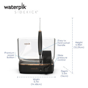 Fio dental de água portátil Waterpik Sidekick, perfeito para viagens e casa, aceito pela ADA, preto/cobre WF-04 — ULTRACOMPACTO E CONVENIENTE: desempenho em tamanho real em um design portátil, ideal para viagens e espaço limitado no balcão, inclui estojo de viagem premium resistente à água. – Use fio dental a qualquer hora, em qualquer lugar: como seu fio dental de água pessoal e portátil, o Sidekick é fácil de usar e embala rapidamente para armazenamento ou viagem, além de ter voltagem global compatível (100 240 VAC, 60/50 Hz) para uso internacional. – RECOMENDADO PELO DENTISTA: 9 em cada 10 profissionais de odontologia recomendam o Marca Waterpik. A Waterpik é clinicamente comprovada e é a primeira marca de fio dental aquático a receber o selo de aceitação da American Dental Association (ADA). – CARACTERÍSTICAS PRINCIPAIS: caneta de fio dental com ponta clássica integrada e alça giratória para facilitar o acesso a todas as áreas da boca, reservatório de 13 onças para 60 segundos de tempo de uso do fio dental, voltagem global, estojo de viagem, medidas montadas 5,5 p x 4,8 a x 5,7 w polegadas. – FÁCIL E EFICAZ: O O fio dental Waterpik Sidekick remove até 99,9% da placa e é até 50% mais eficaz do que o fio dental para melhorar a saúde das gengivas. Basta encher o reservatório com água morna, colocar a ponta na boca e começar a usar fio dental. – GARANTIA E SUPORTE: Com garantia limitada de 3 anos do fabricante, consulte o manual para obter detalhes. A equipe de suporte da Waterpiks Colorado está disponível para ajudar com qualquer dúvida ou necessidade do produto.