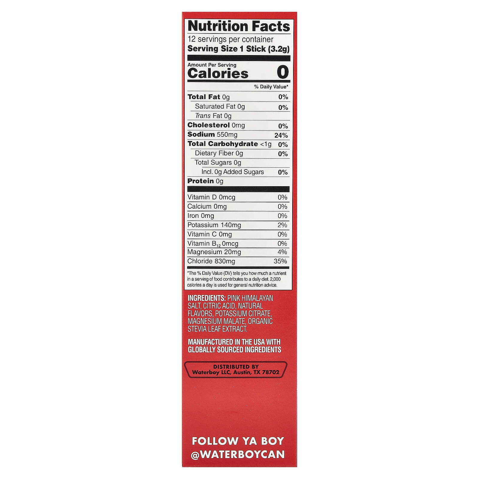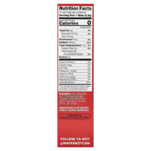 Sal rosa do Himalaia, ácido cítrico, sabores naturais, citrato de potássio, malato de magnésio, extrato da folha de estévia orgânica.