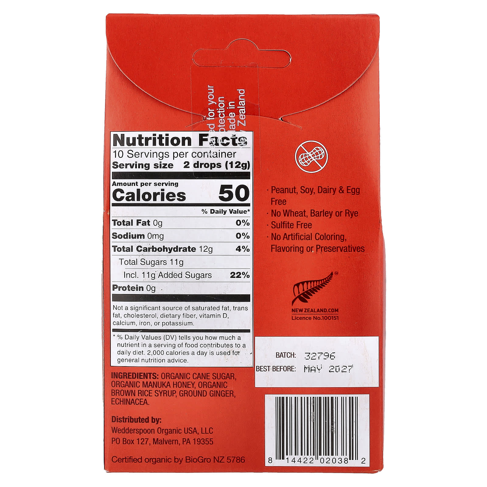 Açúcar de cana orgânico, mel manuka orgânico, xarope de arroz integral orgânico, gengibre em pó, echinacea.