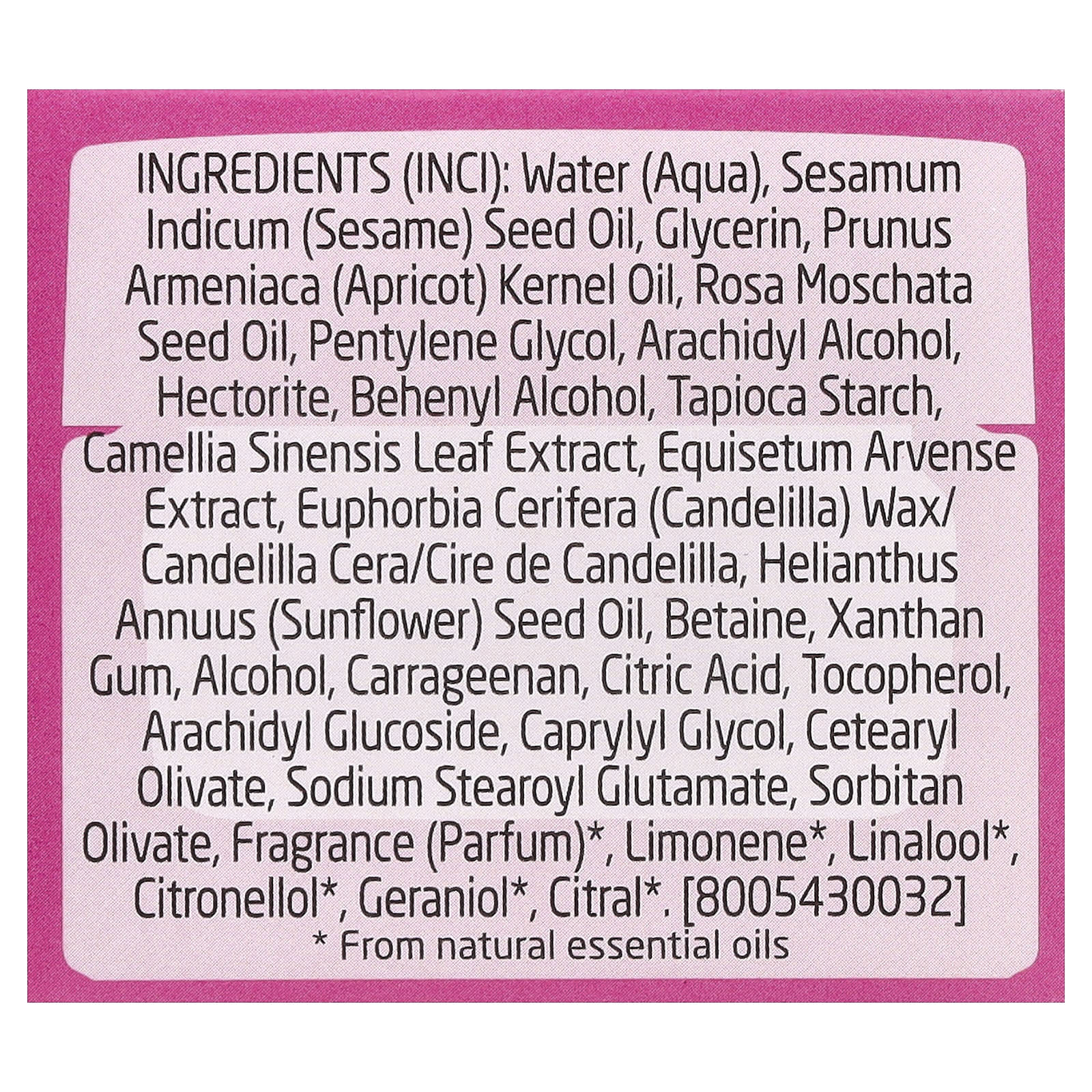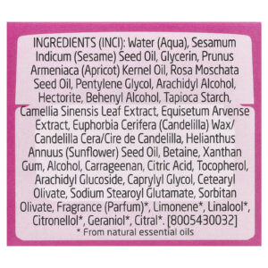Água (aqua), óleo de semente de Sesamum indicum (gergelim), glicerina, óleo da semente de Prunus armeniaca (damasco), óleo da semente de Rosa moschata, pentilenoglicol, arachidyl alcohol, hectorita, behenyl alcohol, amido de tapioca, extrato da folha de Camellia sinensis, extrato de Equisetum arvense, cera de Euphorbia cerifera (candelilla)/cera de candelilla/cire de candelilla, óleo da semente de Helianthus annuus (girassol), betaína, goma xantana, álcool, carragenina, ácido cítrico, tocoferol, arachidyl glucoside, caprylyl glycol, cetearyl olivate, sodium stearoyl glutamate, sorbitan olivate, fragrância (perfume)*, limoneno*, linalol *, citronelol*, geraniol*, citral*.