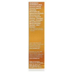 Óleo de semente de Sesamum indicum (gergelim), óleo de Hippophae rhamnoides, extrato da folha de Rosmarinus officinalis (alecrim), fragrância (perfume)*, limoneno*, linalool*, citronellol*, benzoato de benzila*, benzyl salicylate*, geraniol*, citral*, farnesol*.