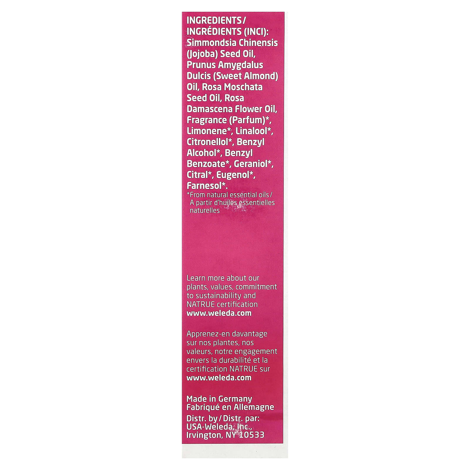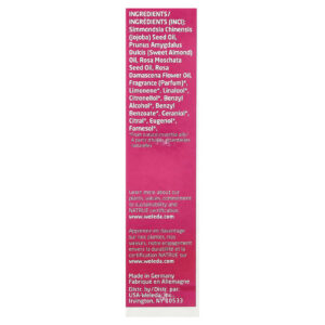 Óleo de semente de Simmondsia chinensis (jojoba), óleo de duncis (óleo de amêndoa doce), óleo de semente rosa moschata, óleo de flor rosa damascena, perfume (parfum) *, limoneno *, linalol *, citronelol *, álcool benzílico *, benzil benzoato *, geraniol *, citral *, eugenol *, farnesol *.