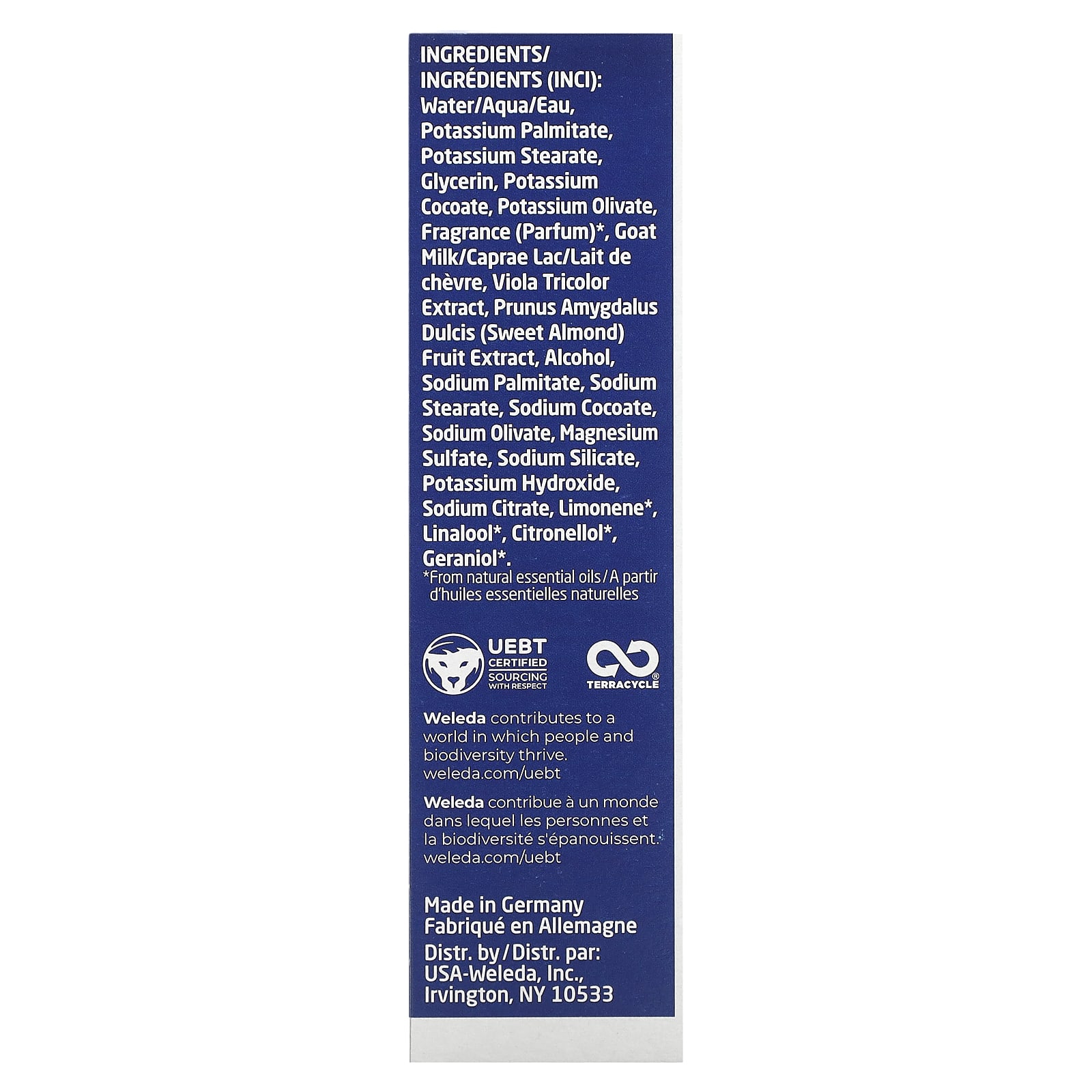 Água, palmitato de potássio, potassium stearate, glicerina, cocoato de potássio, Potassium olivate, fragrância (perfume)*, leite de cabra, extrato de Viola tricolor, extrato da fruta de Prunus amygdalus dulcis (amêndoa doce), álcool, palmitato de sódio, estearato de sódio, sodium cocoate, sodium olivate, sulfato de magnésio, silicato de sódio, hidróxido de potássio, citrato de sódio, limoneno*, linalool*, citronelol*, geraniol*.