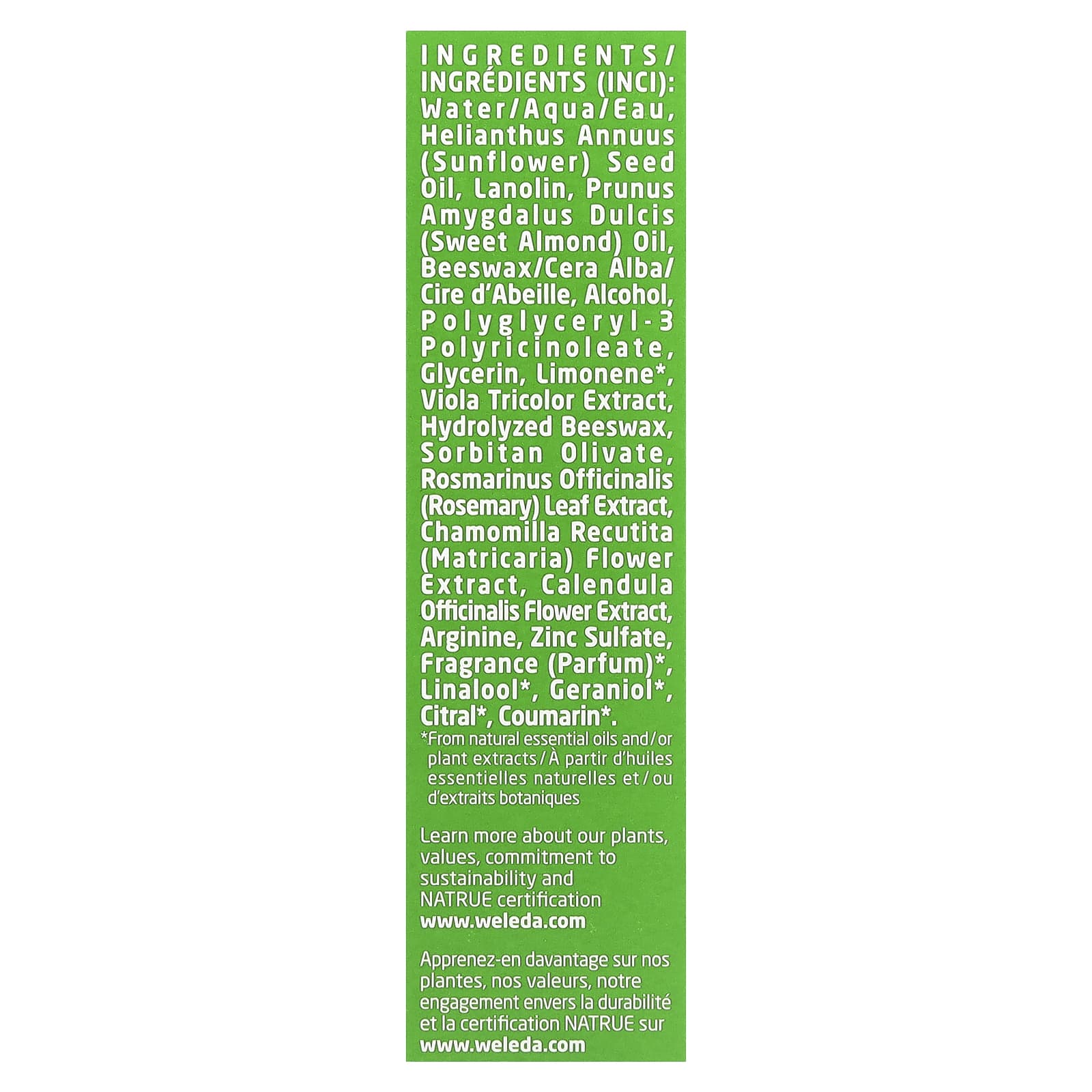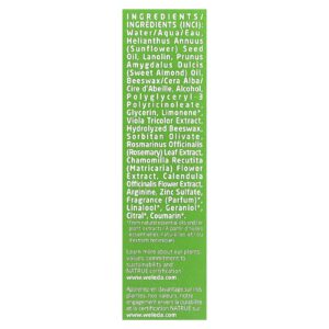 Água, óleo da semente de Helianthus annuus (girassol), lanolina, óleo de Prunus amygdalus dulcis (amêndoa doce), cera de abelha (cera alba), álcool, polyglyceryl-3 polyricinoleate, glicerina, limoneno*, extrato de Viola tricolor, cera de abelha hidrolisada, sorbitan olivate, extrato da folha de Rosmarinus officinalis (alecrim), extrato da flor de Chamomilla recutita (matricária), extrato da flor de Calendula officinalis, arginina, sulfato de zinco, fragrância (perfume)*, linalool*, geraniol*, citral*, cumarina*.