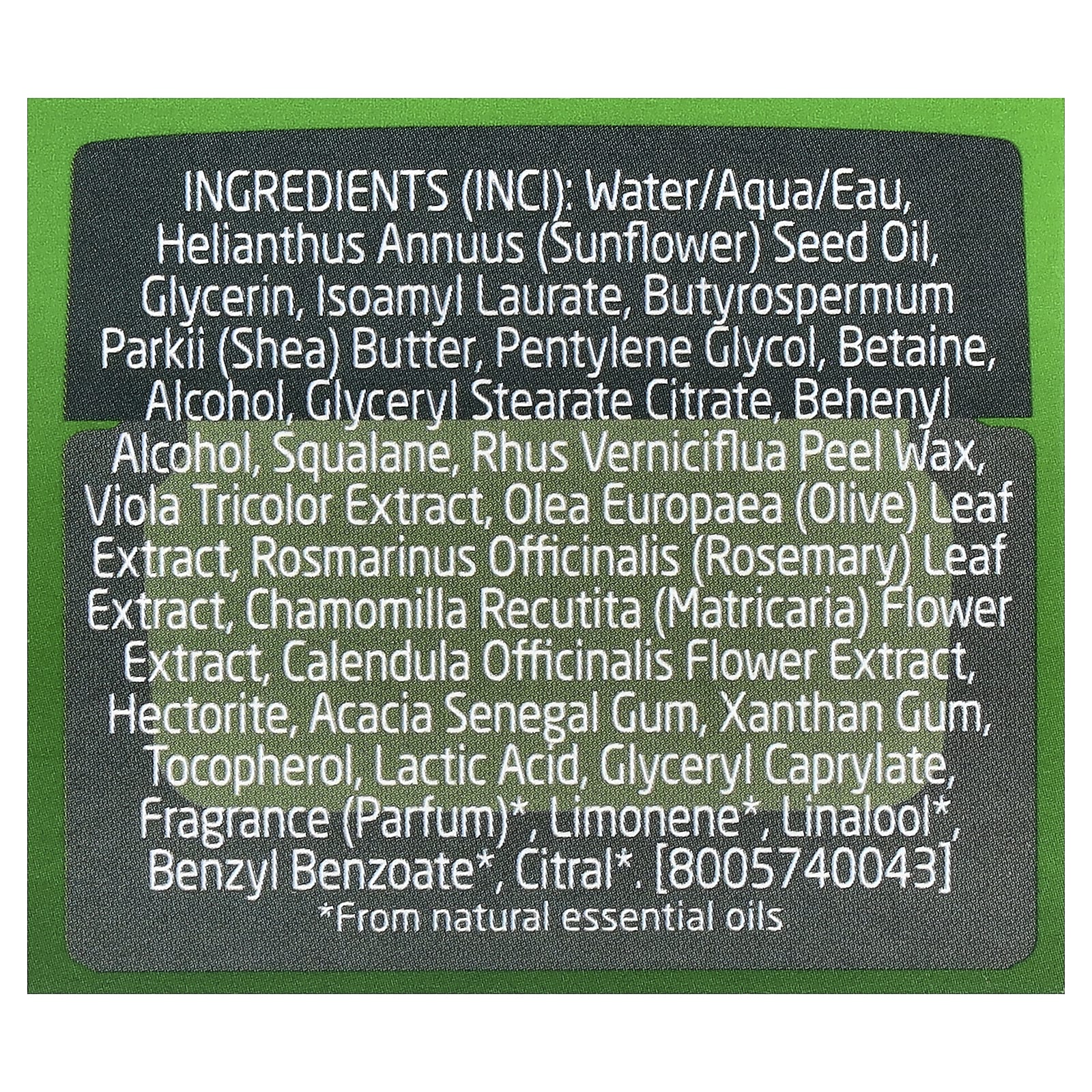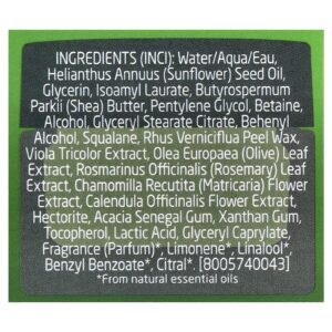 Água/aqua/eau, óleo da semente de Helianthus annuus (girassol), glicerina, laurato de isoamila, manteiga de Butyrospermum parkii (karité), pentilenoglicol, betaína, álcool, citrato de monoestearato de glicerila, behenyl alcohol, esqualano, cera da casca de Rhus verniciflua, extrato de Viola tricolor, extrato da folha de Olea europaea (azeitona), extrato da folha de Rosmarinus officinalis (alecrim), extrato da flor de Chamomilla recutita (matricária), extrato da flor de Calendula officinalis, hectorita, goma de acácia-do-senegal, goma xantana, tocoferol, ácido láctico, caprilato de glicerila, fragrância (perfume)*, limoneno*, benzoato de benzilalinalool*, citral*.