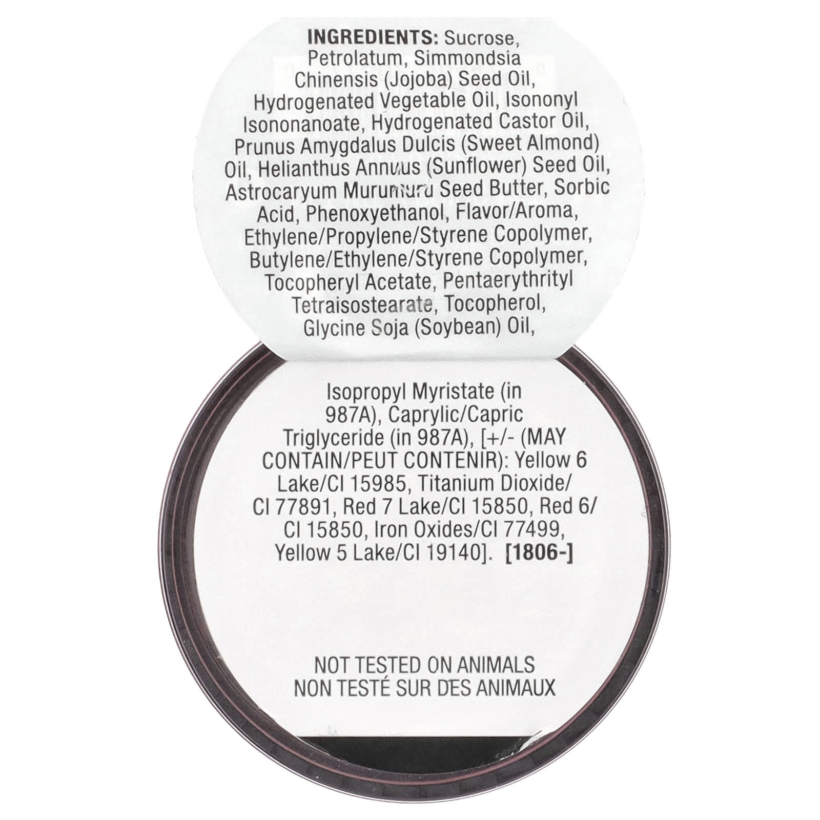 Sacarose, petrolato, óleo da semente de Simmondsia chinensis (jojoba), óleo vegetal hidrogenado, isononyl isononanoate, óleo de rícino hidrogenado, óleo de Prunus amygdalus dulcis (amêndoa doce), óleo da semente de Helianthus annuus (girassol), manteiga de sementes de Murumuru astrocaryum, ácido sórbico, fenoxietanol, sabor/aroma, copolímero de etileno/propileno/estireno, copolímero de butileno/etilo/estireno, acetato de racealfatocoferol, pentaerythrityl tetraisostearate, tocoferol, óleo de Glycine soja (soja), miristato de isopropila (em 987A), caprylic/capric triglyceride (em 987A), [+/- Pode conter: amarelo crepúsculo laca de alumínio/CI 15985, dióxido de titânio/CI 77891, vermelho 7 laca de cálcio/CI 15850, vermelho 6/CI 15850, óxidos de ferro/CI 77499, amarelo de tartrazina laca de alumínio/CI 19140].