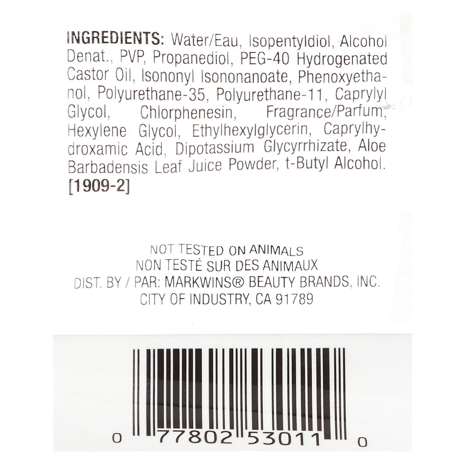 Água/eau, isopentilodiol, álcool desnat., PVP, propanediol, óleo de rícino hidrogenado peg-40, isononyl isononanoate, fenoxietanol, poliuretano-35, poliuretano-11, caprylyl glycol, clorfenesina, fragrância/perfume, hexylene glycol, ethylhexylglycerin, caprylhydroxamic acid, dipotassium glycyrrhizate, pó do suco da folha de Aloe barbadensis, álcool t-butílico.