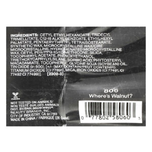 Etilcaproato de cetila, tridecyl trimellitate, c12-15 alkyl benzoate, ethylhexyl palmitate, pentaerythrityl tetraisostearate, cera sintética, cera microcristalina/cire microcristalina, cera microcristalina hidrogenada, cetyl peg/ppg-10/1 dimethicone, sílica, acetato de tocoferol, fenoxietanol, triethoxycaprylylsilane, ácido sórbico, phytosteryl macadamiate, tocoferol, óleo de Glycine soja (soja), óxido de estanho (em 800), [+/- (pode conter/peut contenir): dióxido de titânio (CI 77891), mica, óxidos de ferro (CI 77491, CI 77492 (CI 77499)].