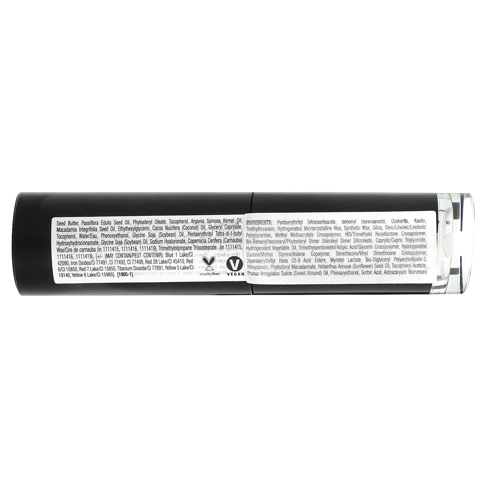 Pentaerythrityl tetraisostearate, isononyl isononanoate, ozocerita, caulim, triethylhexanoin, cera microcristalina hidrogenada, cera sintética, sílica, poliglicerídeos oleicos/linoleicos/linolênicos, copolímero de dimetacrilato de etilenoglicol e metacrilato de metila, crospolímero de HDI/trimetilol hexilactona, bis-behenyl/isostearyl/phytosteryl dimer dilinoleyl dimer dilinoleate, caprylic/capric triglyceride, óleo vegetal hidrogenado, trimethylpentanediol/ácido adípico/crospolímero de glicerina, hydrogenated styrene/methyl styrene/indene copolymer, dimethicone/vinyl dimethicone crosspolymer, ésteres de ácido dipentaeritril hexa C5-9, lactato de miristilo, bis-diglyceryl polyacyladipate-2, triheptanoin, phytosteryl macadamiate, óleo da semente de Helianthus annuus (girassol), acetato de tocoferol, óleo de Prunus amygdalus dulcis (amêndoa doce), fenoxietanol, ácido sórbico, manteiga da semente de Murumuru astrocaryum, óleo da semente de Passiflora edulis, fitoesterol, tocoferol, óleo do grão de Argania spinosa, óleo da semente de Macadamia integrifolia, ethylhexylglycerin, óleo de Cocos nucifera (coco), caprilato de glicerila, tocoferol, água, fenoxietanol, óleo de Glycine soja (soja), pentaerythrityl tetra-di-t-butyl hydroxyhydrocinnamate, óleo de Glycine soja (soja), hialuronato de sódio, cera de Copernicia cerifera (carnaúba) (em 1111415,1111416,1111419), trimethylolpropane triisostearate (em 1111415,1111416,1111419), [+/- (pode conter): azul brilhante laca de alumínio/CI 42090, óxidos de ferro/CI 77491, CI 77492, CI 77499, vermelho 28 laca de alumínio/CI 45410, vermelho 6/CI 15850, vermelho 7 laca de alumínio/CI 15850, dióxido de titânio/CI 77891, amarelo crepúsculo laca de alumínio/CI 19140, amarelo crepúsculo laca de alumínio/CI 15985].