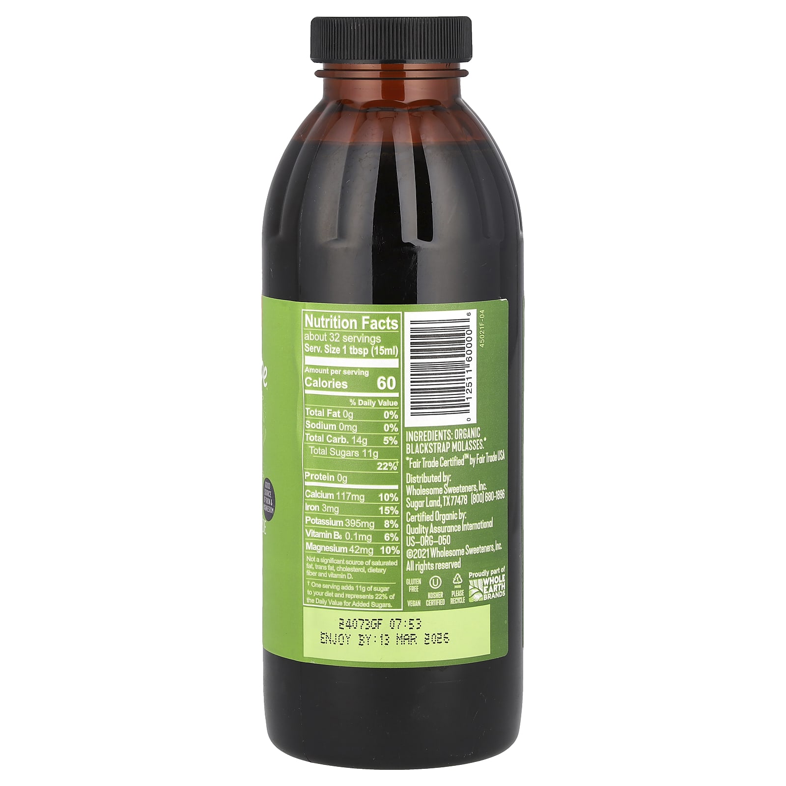 Wholesome Sweeteners Melaço Orgânico Sem Enxofre 473 ml (16 fl oz) – Wholesome Alimentos Mel e adoçantes.
