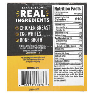 Peito de frango sem antibióticos, amido de tapioca nativa, óleo de girassol com alto teor oleico, claras de ovo, caldo de ossos de galinha, açúcar. contém menos de 2% do seguinte: açúcar de bordo, sal marinho, especiarias, sabores naturais, ácido cítrico, citrato de sódio, amido de tapioca modificado, maltodextrina.