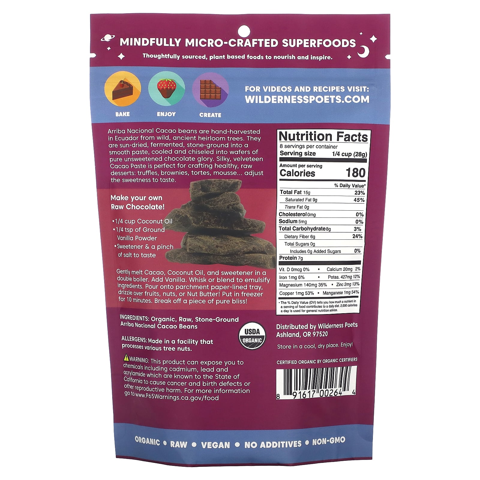 Wilderness Poets Pasta de Cacau Orgânico Arriba Nacional Chocolate Amargo 226 g (8 oz) – Wilderness Poets Suplementos Superalimentos Cacau.