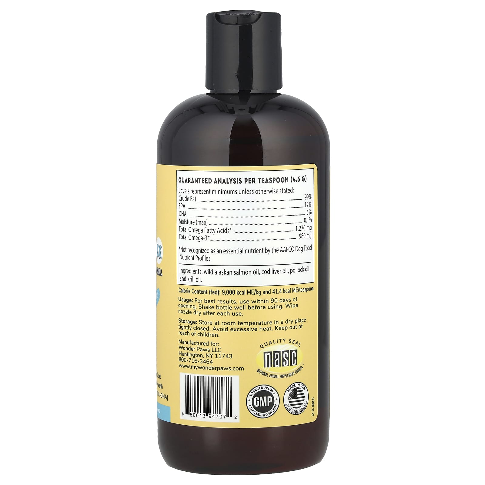 Wonder Paws Superhero® Omega Max 3X Óleo de Peixe Salmão Selvagem do Alasca + Bacalhau + Krill Para Cães Todas as Idades 473 ml (16 oz) – Wonder Paws Pets Suplementos para pets Suplementos para cães Ômegas e óleos para cães.