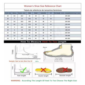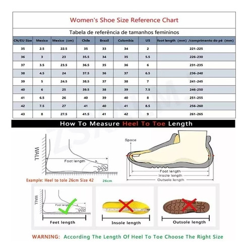 Encontre o tamanho que combina com você. Se você tiver pés mais grossos ou mais gordos, é recomendável escolher um tamanho maior. (Por exemplo, o comprimento do pé é 23,5 cm e o tamanho correspondente é: BR 35 = MX3,5 = UE 37, mas o peito do pé é mais grosso ou mais gordo. Em seguida, escolha um tamanho maior: BR 36 = MX4,5 = UE 38). Depois de fazer um pedido, nós o enviaremos imediatamente e aguardamos sua atenção e compra.