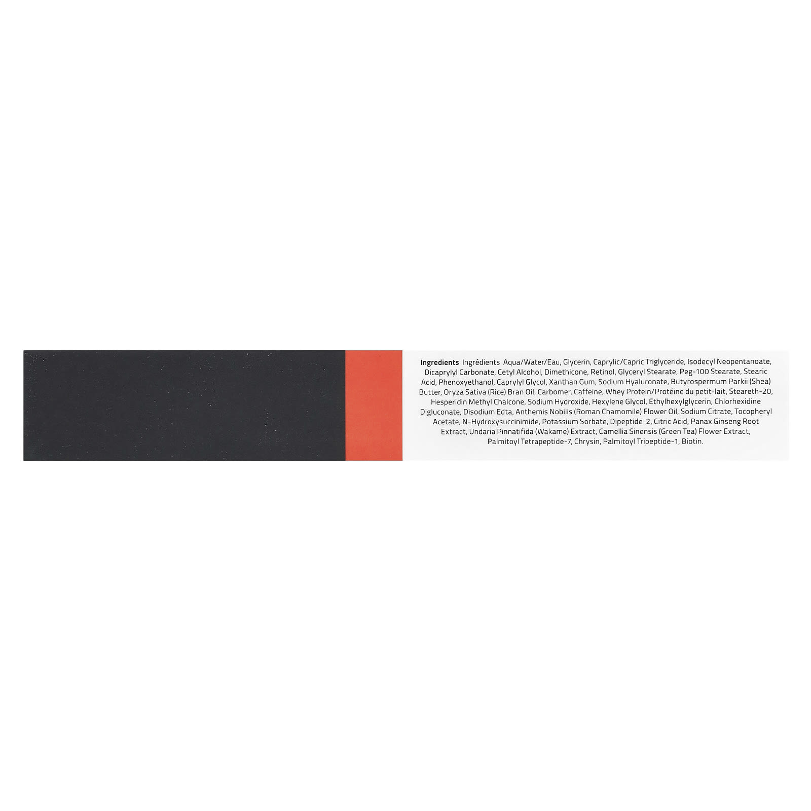 Água/aqua/eau, glicerina, caprylic/capric triglyceride, neopentanoato de isodecila, dicaprylyl carbonate, álcool cetílico, dimeticona, retinol, monoestearato de glicerila, estearato de PEG-100, ácido esteárico, fenoxietanol, caprylyl glycol, goma xantana, hialuronato de sódio, manteiga de Butyrospermum parkii (karité), óleo de farelo de Oryza sativa (arroz), carbômer, cafeína, proteína whey/proteína de petit-lait, steareth-20, hesperidin methyl chalcone, hidróxido de sódio, hexylene glycol, ethylhexylglycerin, digliconato de clorexidina, edetato dissódico, óleo da flor de Anthemis nobilis (camomila romana), citrato de sódio, acetato de tocoferol, n-hydroxysuccinimide, sorbato de potássio, dipeptídeo-2, ácido cítrico, extrato da raiz de Panax ginseng, extrato de Undaria pinnatifida (wakame), extrato da flor de Camellia sinensis (chá verde), palmitoyl tetrapeptide-7, crisina, tripeptídeo palmitoil-1, biotina.