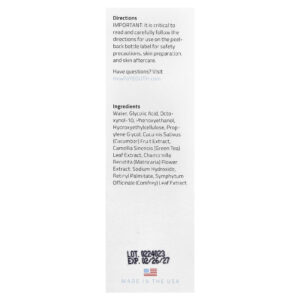 Água, ácido glicólico, octoxinol-10, fenoxietanol, hietelose, propilenoglicol, extrato do fruto de Cucumis sativus (pepino), extrato da folha de Camellia sinensis (chá verde), extrato da flor de Chamomilla recutita (matricária), hidróxido de sódio, palmitato de retinol, extrato da folha de Symphytum officinale (confrei).