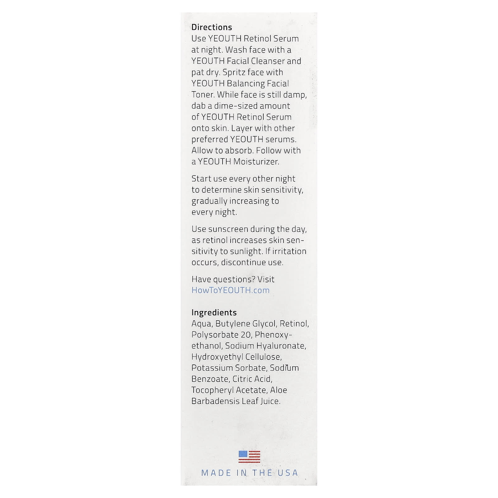 Use o Sérum de Retinol da YEOUTH à noite. Lave o rosto com o Produto de Limpeza Facial da YEOUTH e seque dando leves batidinhas. Borrife o rosto com o Tônico Facial Balanceador da YEOUTH. Com o rosto ainda úmido, aplique uma pequena quantidade do Sérum de Retinol da YEOUTH na pele. Faça camadas com outros séruns favoritos da YEOUTH. Deixe absorver. Em seguida, aplique um Hidratante da YEOUTH.