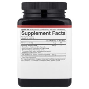 | Mistura Patenteada de Superfrutas Extrato de Acerola (fruta) (25% de Vitamina C), Extrato de Uva (fruta), Uva de Muscadine (semente) em pó, Extrato de Açaí (Euterpe oleracea), Extrato de romã (casca), Framboesa vermelha (fruta) em pó, Extrato de Yumberry (fruta) (Myrica rubra) |