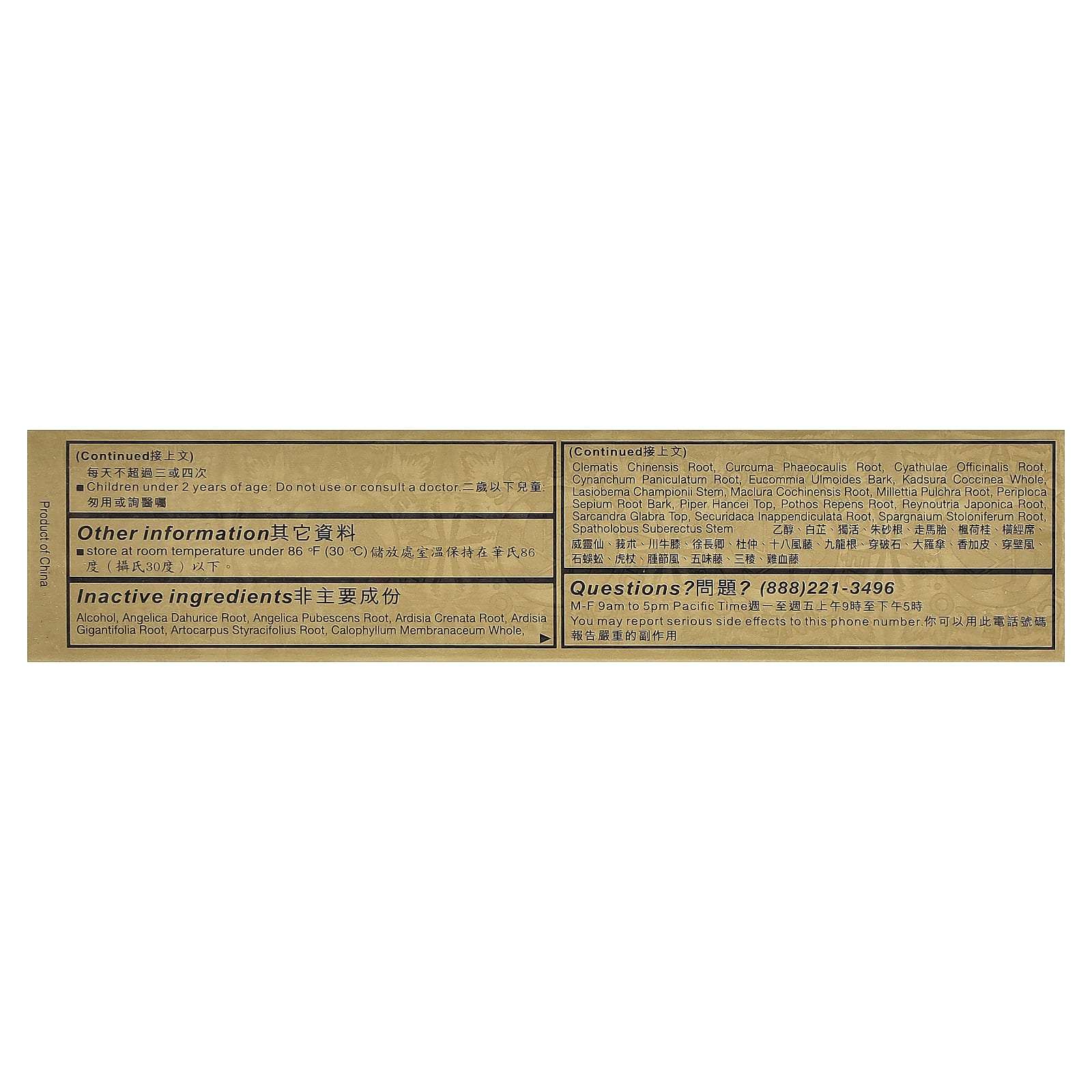 | Álcool, raiz de Angelica dahulice, raiz de Angelica pubescens, raiz de Ardisia crenata, raiz de Ardisia gigantifolia, raiz de Artocarpus styracifolius, Calophyllum membranaceum inteira, raiz de Clematis chinensis, raiz de Curcuma phaeocaulis, raiz de Cyathulae officinalis, raiz de Cynanchum paniculatum, casca de Eucommia ulmoides, Kadsura coccinea inteira, caule de Lasiobema Championii, raiz de Maclura cochinensis, raiz de Millettia pulchra, casca da raiz de Periploca sepium, parte superior de Piper hancei, raiz de Pothos repens, raiz de Reynoutria japonica, parte superior de Sarcandra glabra, raiz de Securidaca inappendiculata, raiz de Spargnaium stoloniferum, caule de Spatholobus suberecto. | |
