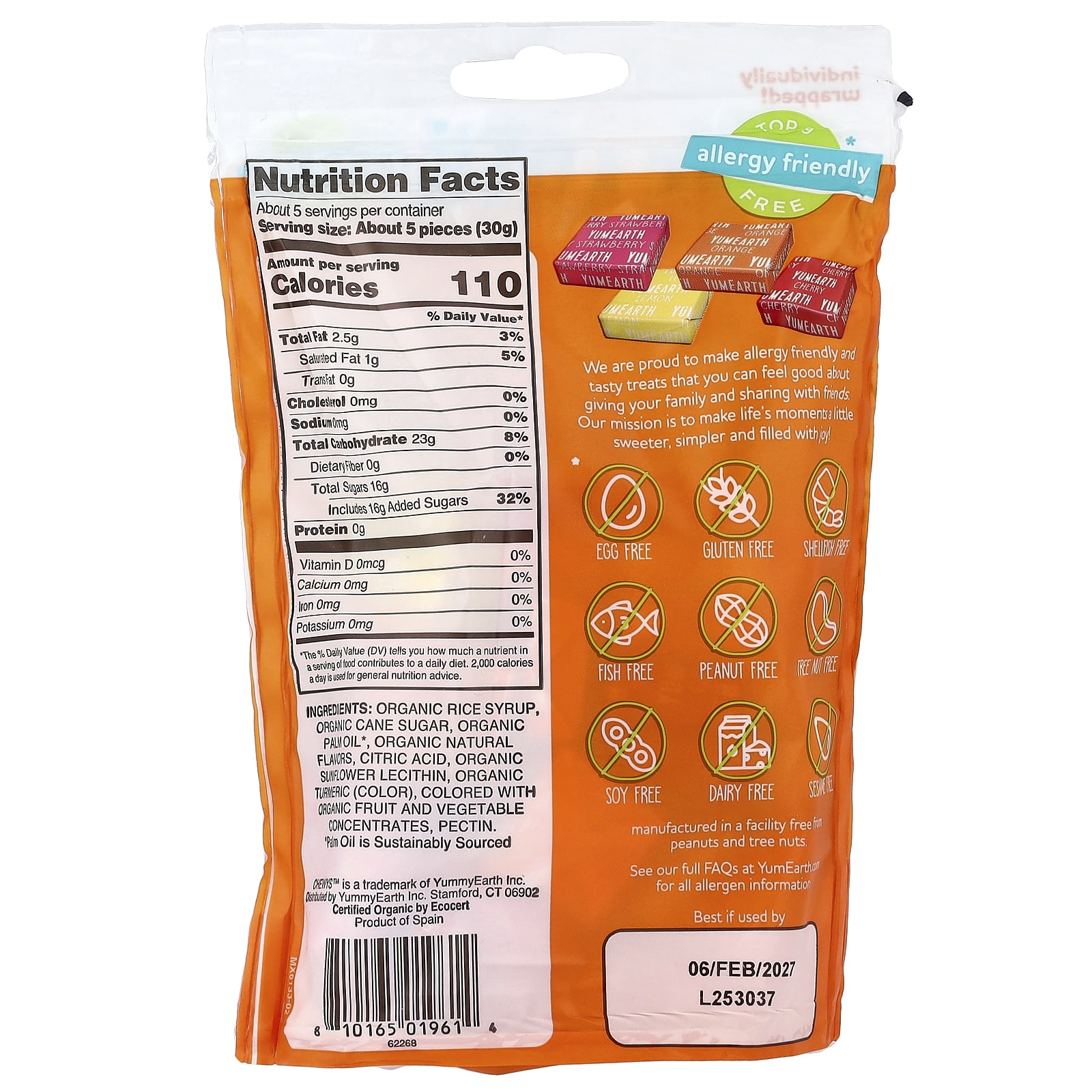 Xarope de arroz orgânico, açúcar de cana orgânico, óleo de palma orgânica*, sabores naturais orgânicos, ácido cítrico, lecitina de girassol orgânico, cúrcuma orgânica (corante), coloração com concentrados de frutas e vegetais orgânicos, pectina.