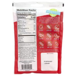 Açúcar de cana orgânica, xarope de arroz orgânico, óleo de palma orgânica*, ácido cítrico, sabores naturais orgânicos, citrato de sódio, lecitina de girassol orgânico, colorido com frutas orgânicas & concentrados de vegetais, extrato de cúrcuma orgânica (corante), ácido málico, cera de carnaúba orgânica, espirulina orgânica (corante), pectina.