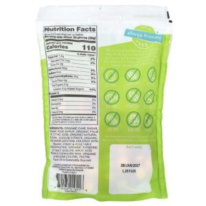 Açúcar de cana orgânico, xarope de arroz orgânico, óleo de palma orgânico, ácido cítrico, sabores naturais orgânicos, citrato de sódio, cúrcuma (corante), lecitina de girassol orgânico, ácido málico, (rabanete, cenoura, batata-doce, groselha negra) para dar cor, cera de carnaúba orgânica, concentrado de espirulina (corante), pectina.