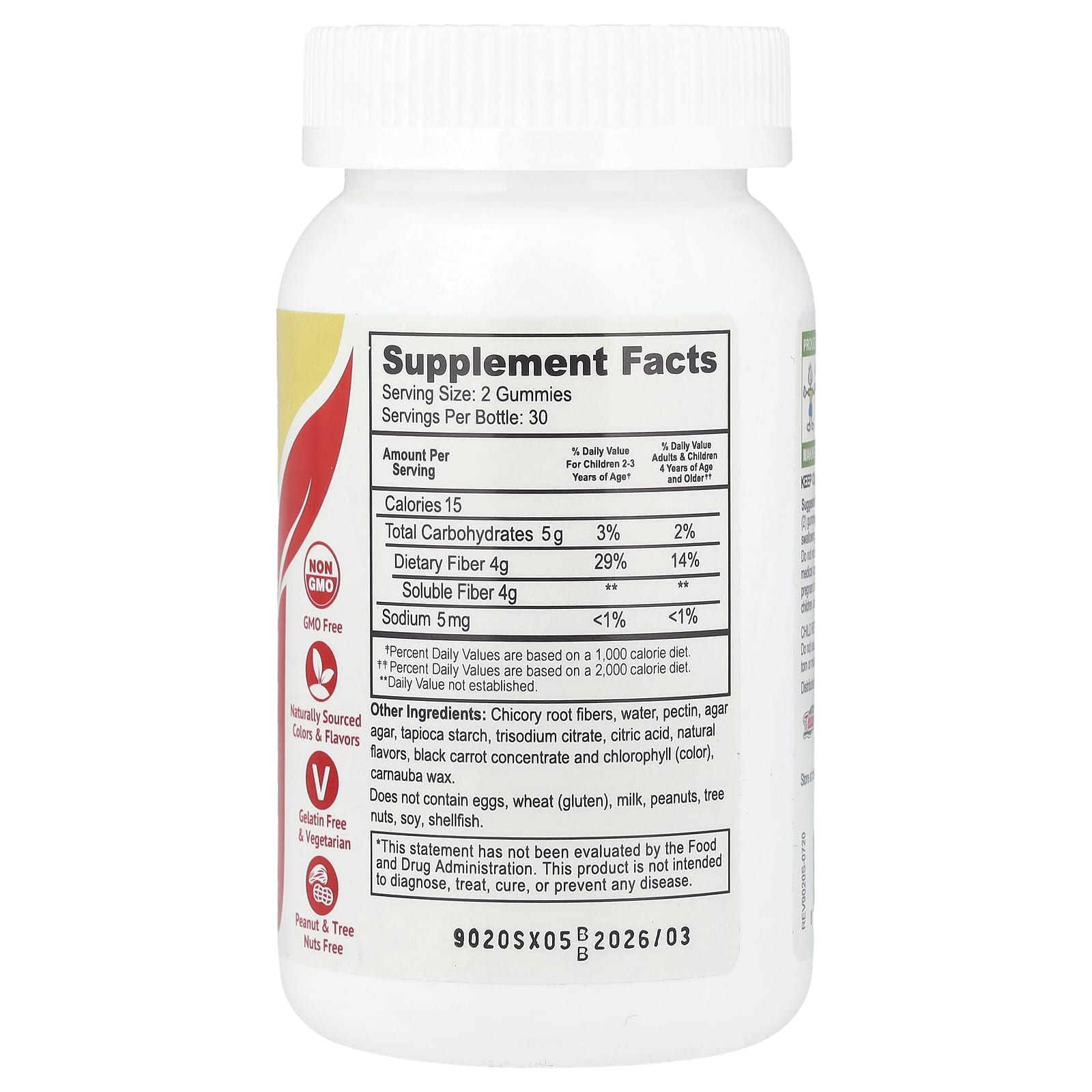 fibra da raiz de chicória, água, pectina, ágar-ágar, amido de tapioca, citrato trissódico, ácido cítrico, sabores naturais, concentrado de cenoura preta e clorofila (corante), cera de carnaúba.