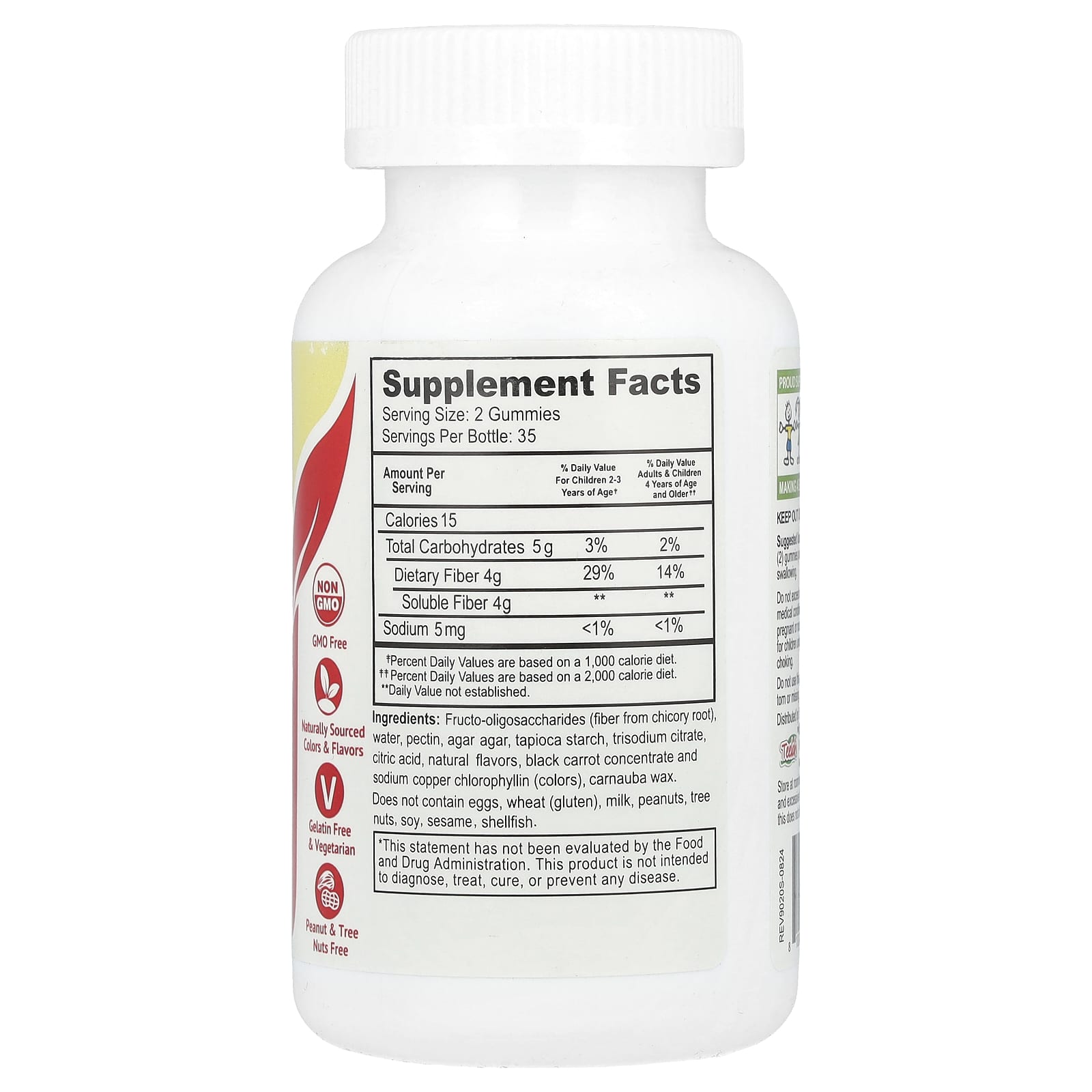 Fruto-oligossacarídeos (fibra da raiz de chicória), água, pectina, ágar-ágar, amido de tapioca, citrato trissódico, ácido cítrico, sabores naturais, concentrado de cenoura preta e clorofilina de cobre de sódio (corantes), cera de carnaúba.