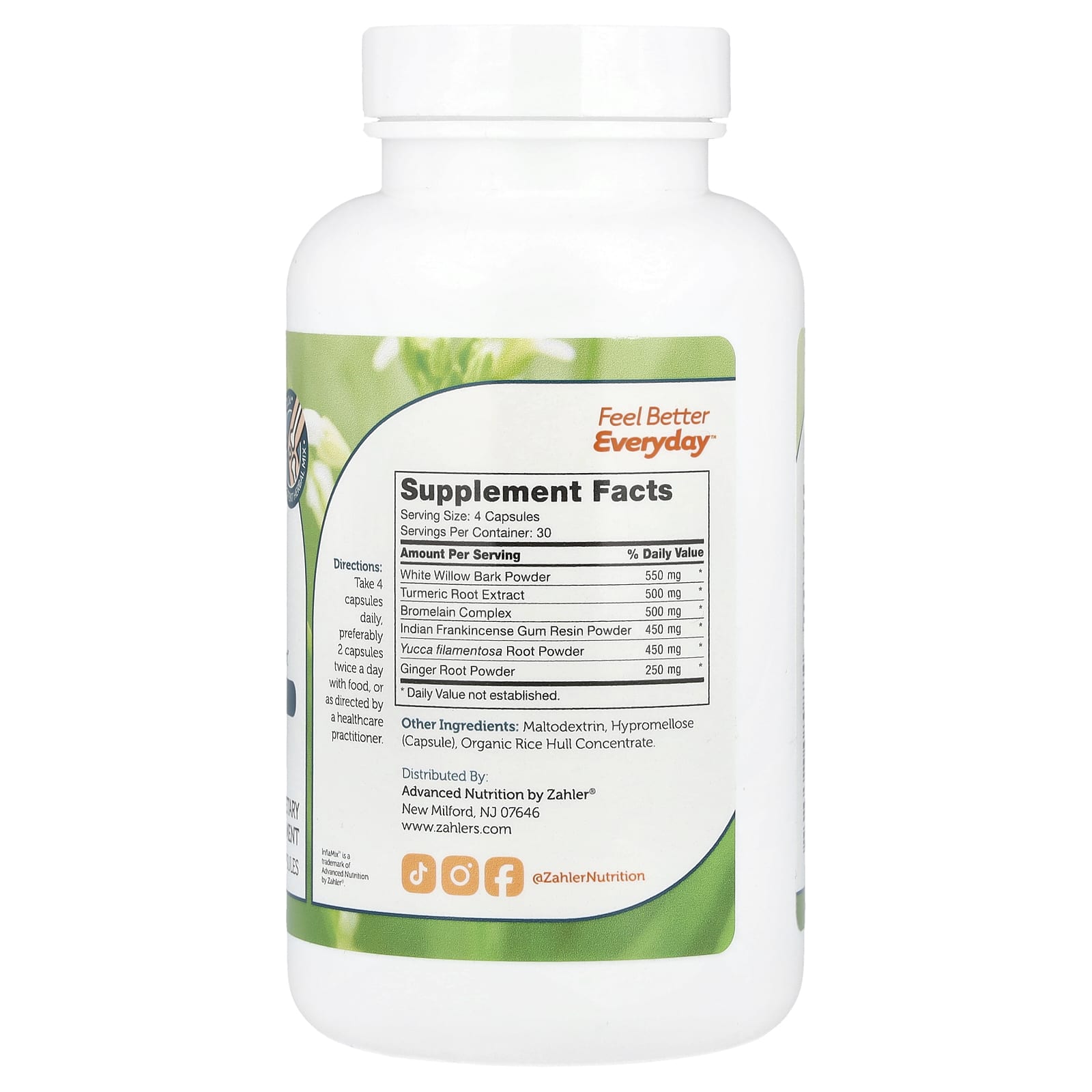 InflaMix™ da Zahler contém uma combinação de ingredientes que fornecem alívio leve à dor e promovem uma resposta inflamatória saudável após exercícios extenuantes. A suplementação adequada auxilia no processo de recuperação natural do corpo.