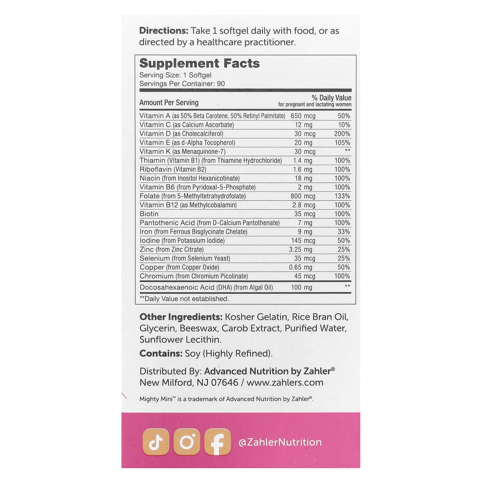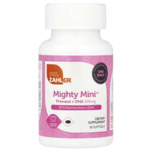 Zahler Mighty Mini ™ é um comprimido do tamanho de um litro e fácil de engolir que fornece um espectro completo de nutrientes essenciais + DHA, os quais são cruciais para você e seu bebê em desenvolvimento.