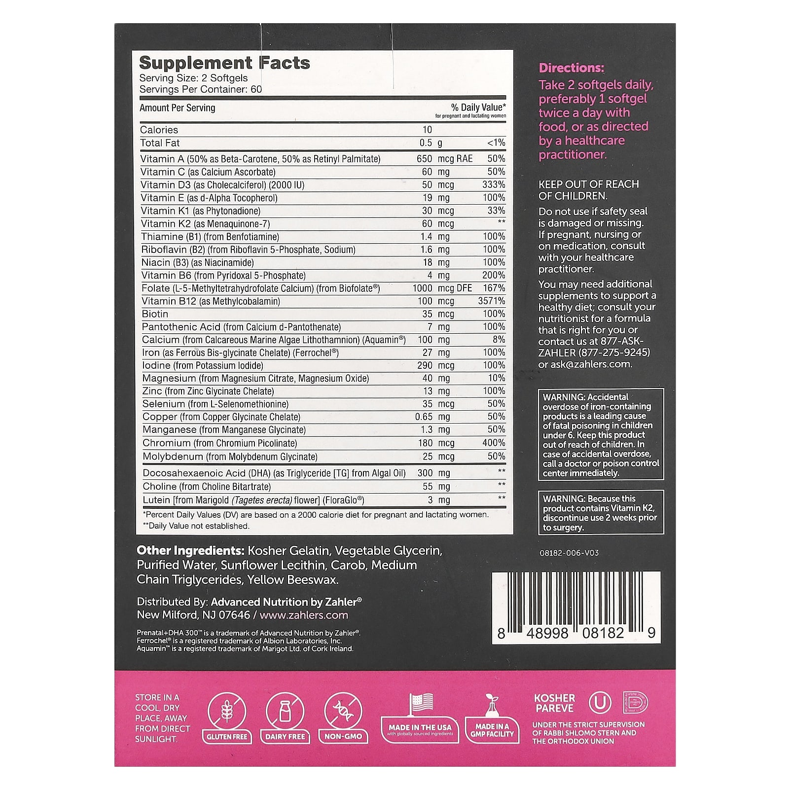 Zahler® Prenatal + DHA é uma fórmula equilibrada e sinérgica que fornece uma compilação selecionada de nutrientes de que seu bebê em desenvolvimento precisa nas proporções ideais para absorção, metabolismo e segurança.