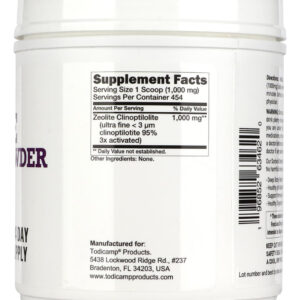 Experience the power of pristine nature with our premium Organic Zeolite Detox Powder, meticulously formulated for effective deep cleansing. Featuring high-grade, micronized zeolite clinoptilolite sourced from select organic deposits, our powder is a beacon of health for those seeking a potent cellular detox, mold detox, and overall toxin elimination. Broad-Spectrum Detoxification: Each dose contains pure clinoptilolite zeolite, renowned for its ability to bind and eliminate pollutants, including toxins. Its an ideal choice for a thorough cleanse, acting as a natural mineral zeolite binder supplement. Family-Friendly Formula: Safe and gentle, our zeolite powder is fine enough for effective absorption and powerful enough to be used as a detox for adults as well as a zeolite detox for kids. Its the ultimate solution for family-wide environmental defense. Organic Quality: With no additives or artificial ingredients, our organic zeolite for humans is crafted to meet the highest standards of purity. Zeolite+organic compounds make our powder both safe and effective for your detox needs. Convenient Daily Detox: Our detox powder is easy to incorporate into your daily routine, providing a straightforward way to achieve a full body cleanse. Whether youre dealing with toxin exposure or looking for a routine cleanse, our product supports your health without complication. Clinically Proven Efficacy: Our activated zeolite and clinoptilolite zeolite powder have undergone rigorous testing to ensure they deliver results. Manufactured in a GMP-certified facility, our zeolite supplements stand for reliability and trust. Begin your journey with our Zeolite Detox Powder. Theyre not just detox powders; theyre a step towards a healthier lifestyle. Perfect for those practicing detox or seeking a natural cleanse, our powder works to effectively remove waste from your body and restore your vibrant health. – CELLULAR DETOX: Clinoptilolite Zeolite Powder works as a molecular sieve. With its highest absorption capacity, zeolite powder captures and eliminates toxins, deposits, and waste directly from cells, promoting thorough detoxification. This deep cellular cleansing aids in restoring cellular function, enhancing nutrient absorption, and optimizing metabolic processes. – COLON DETOX: Zeolite Powder Sorbolit is an Ultra-Fine 1-2 m Pure Zeolite Clinoptilolite powder. This extra-thin particle absorbs deposits and gas-producing toxins, supporting a healthy microbiome. It also regulates metabolism in the large and small intestines, affecting anaerobic fermentation, providing relief from chronic bloating, and supporting a more balanced digestive system. – LIVER DETOX: Powder Zeolite effectively reduces the level of transaminases and liver load and stabilizes cell membranes. As a result, clinoptilolite zeolite detox powder stimulates the liver to cleanse and regenerate. Enhanced liver detoxification improves digestion, nutrient absorption, and overall metabolic health. – SKIN HEALTH: Zeolite Clinoptilolite powder supports clearer, healthier skin by eliminating internal toxins. Its ability to bind toxins and other pollutants reduces the burden on the skin, which often reflects internal toxicity. Studies have shown that zeolites detoxifying properties help reduce acne and blemishes, promoting a radiant complexion and improving skin texture and tone. – LYMPHATIC DETOX: Zeolite Sorbolit detox powder also plays a crucial role in supporting lymphatic detoxification. The lymphatic system, responsible for removing waste and toxins from bodily tissues, can become overwhelmed by environmental pollutants and internal waste products. Todicamp zeolite powder aids in this process by binding to these toxins and facilitating their removal, thereby enhancing lymphatic function.
