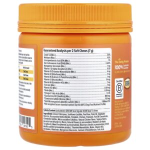 Grão-de-bico moído, lecitina de girassol, farinha de ervilha, óleo de palma, glicerina vegetal, cloridrato de glicosamina, abóbora, frango, linhaça, concentrado de óleo de peixe, sulfato de condroitina, celulose microcristalina, sabor natural de frango, amido de tapioca, ácido ascórbico (vitamina C), ácido nicotínico, sabores naturais (um conservante), vitamina E (dextroalfatocoferol), tocoferóis mistos (um conservante), extrato de alecrim (um conservante), produto de fermentação de Bacillus subtilis seco, mononitrato de tiamina, biotina, vitamina B12, piridoxina, riboflavina, gliconato de manganês, d-pantotenato de cálcio, ácido fólico.