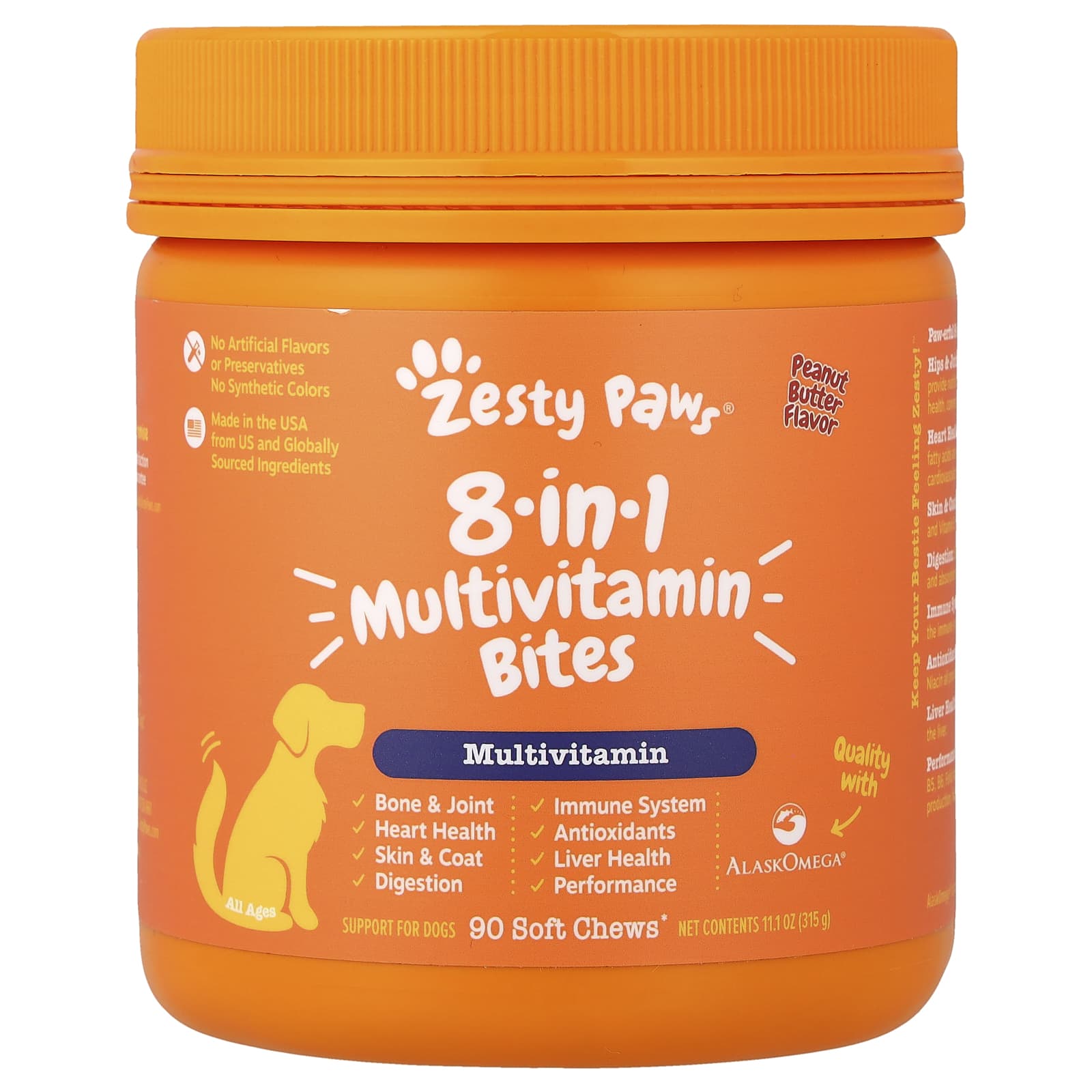 Zesty Paws Multivitamínico 8-in-1 Bites Para Cães Todas as Idades Manteiga de Amendoim 90 Cápsulas Mastigáveis 315 g (111 oz) – Zesty Paws Animais de Estimação Suplementos para pets Suplementos para cães Vitaminas e minerais para cães.