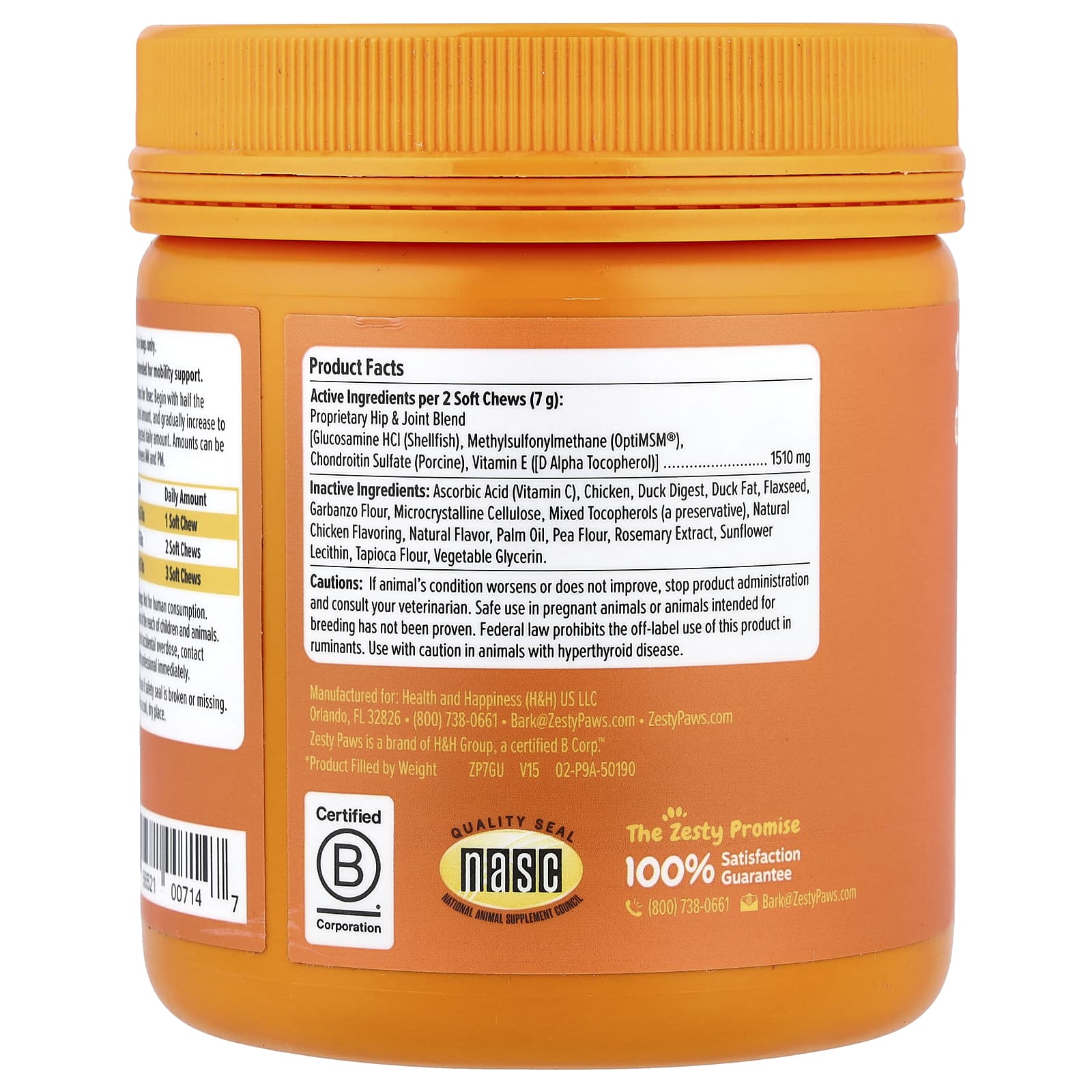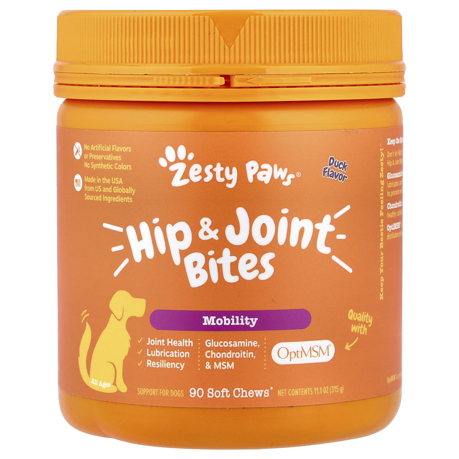 Zesty Paws Quadril e Articulações Bites Para Cães Todas as Idades Pato 90 Cápsulas Mastigáveis 315 g (111 oz) – Zesty Paws Pets Suplementos para pets Suplementos para cães Apoio para quadril e articulações de cães Vitaminas e minerais para cães.