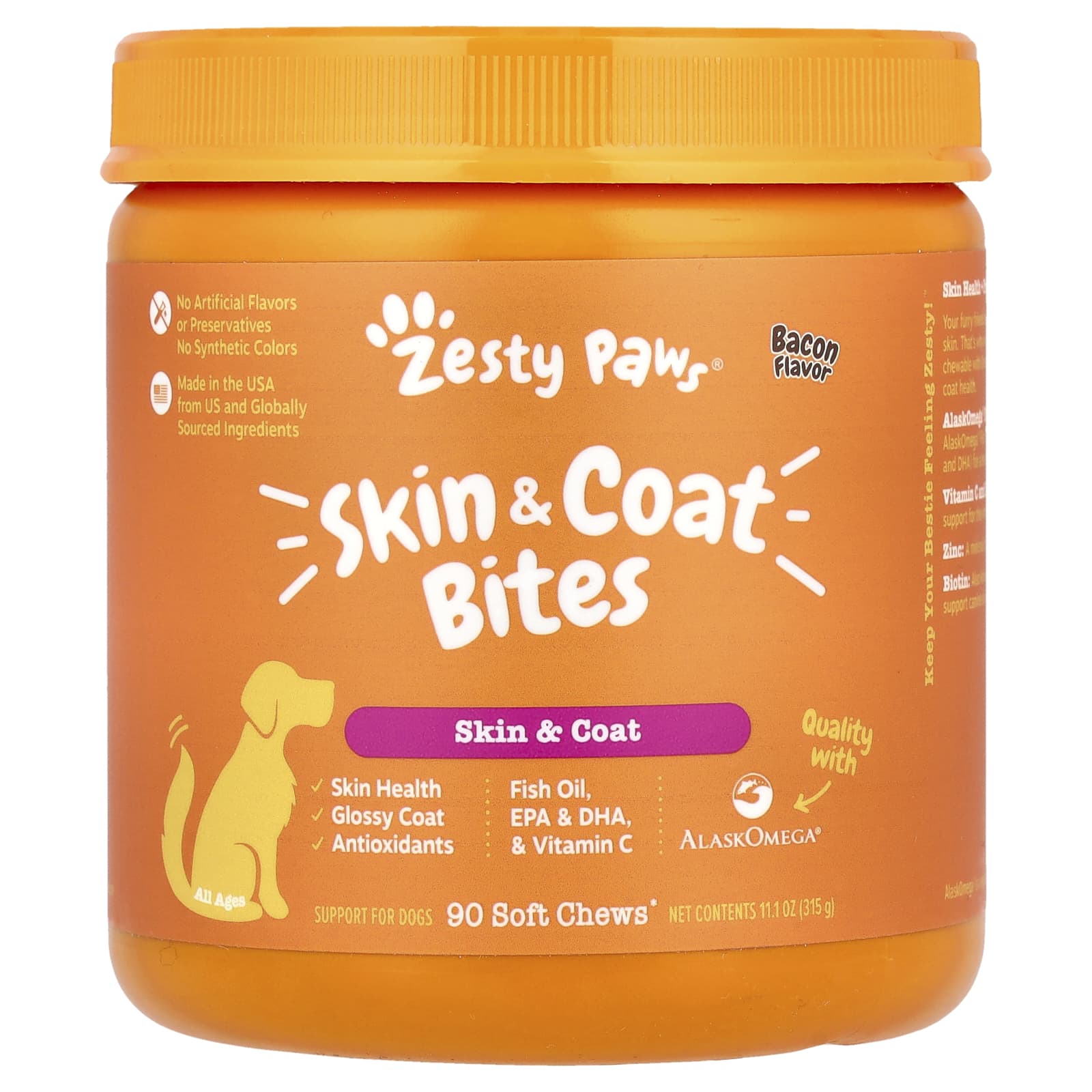 Zesty Paws Skin & Pelot Bites Para Cães Todas as Idades Bacon 90 Cápsulas Mastigáveis 315 g (111 oz) – Zesty Paws Animais de Estimação Suplementos para pets Suplementos para cães Ômegas e óleos para cães.